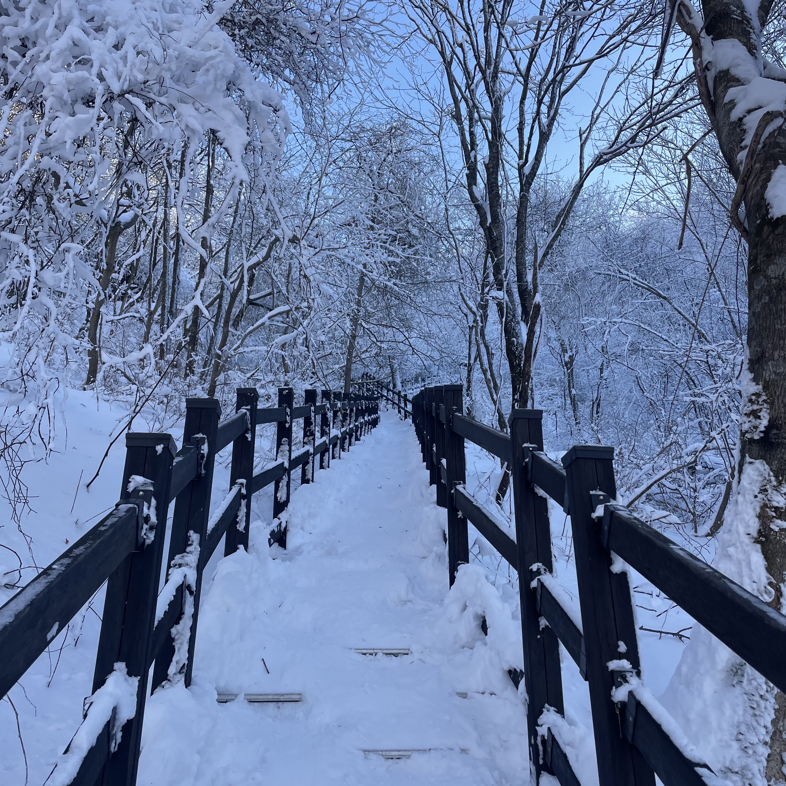 심심할 수 있는 임도길이지만 눈이 소복히 쌓여있어 걸어가는 재미가 있습니다. 하얀길 좌우에 초록 나무들이 있어 너무 이국적이었습니다.