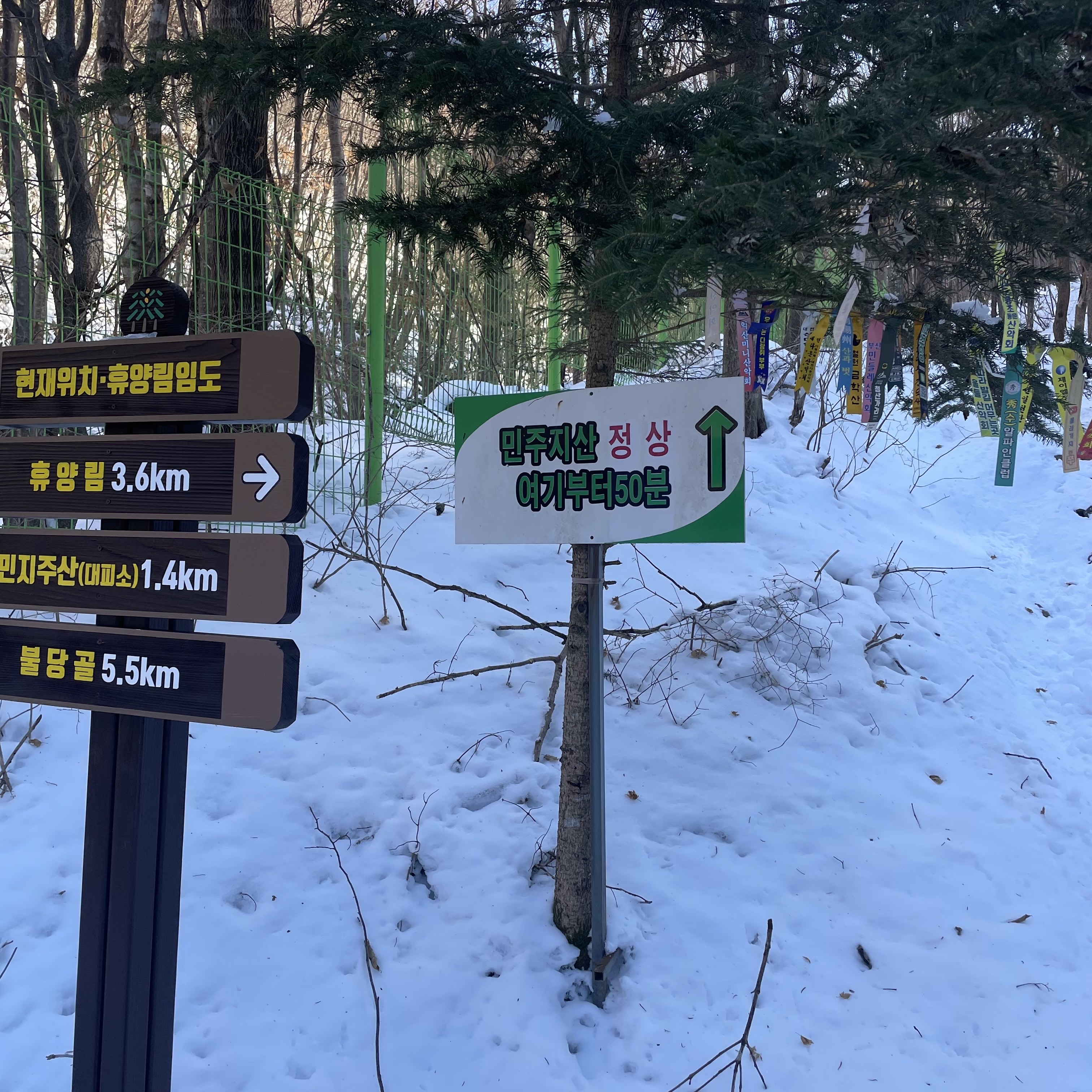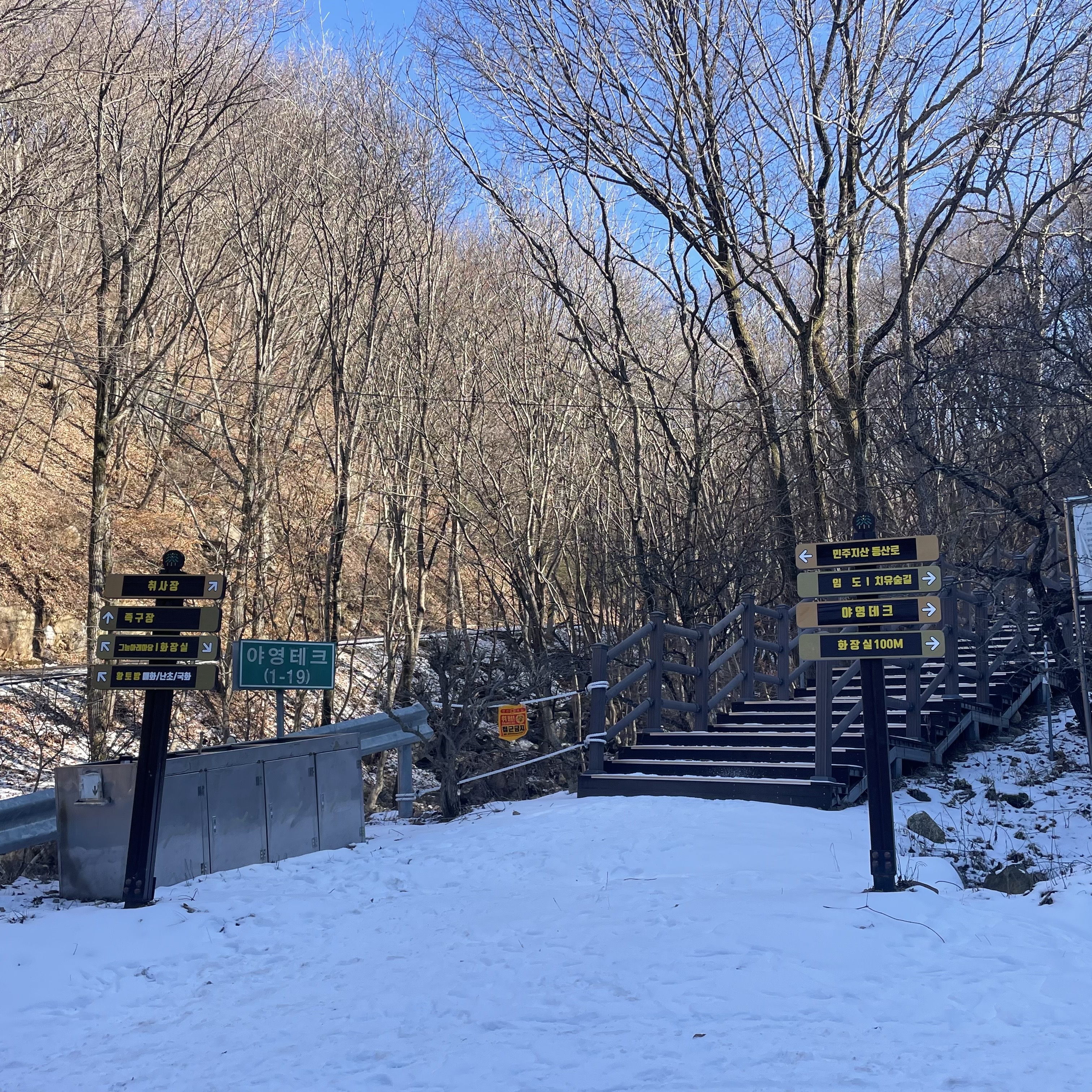 민주지산 자연휴양림을 네비에 찍고 출발하시면 매표소 옆에 주차장이 있습니다. 그곳에 주차를 하시면 됩니다. 자연휴양림이 현재는 휴관중이어서 위로 올라가는 임도를 통제한건지 눈이 많이 쌓여있어서 통제중인지 모르겠지만 최단코스를 가시는 분들은 통제가 없다면 임도를 타시고 쭈욱 위로 올라가시면 됩니다. 민주지산 자체가 너무 예뻐서 한여름에는 자연휴양림을 이용해도 좋을 것 같더라구요.