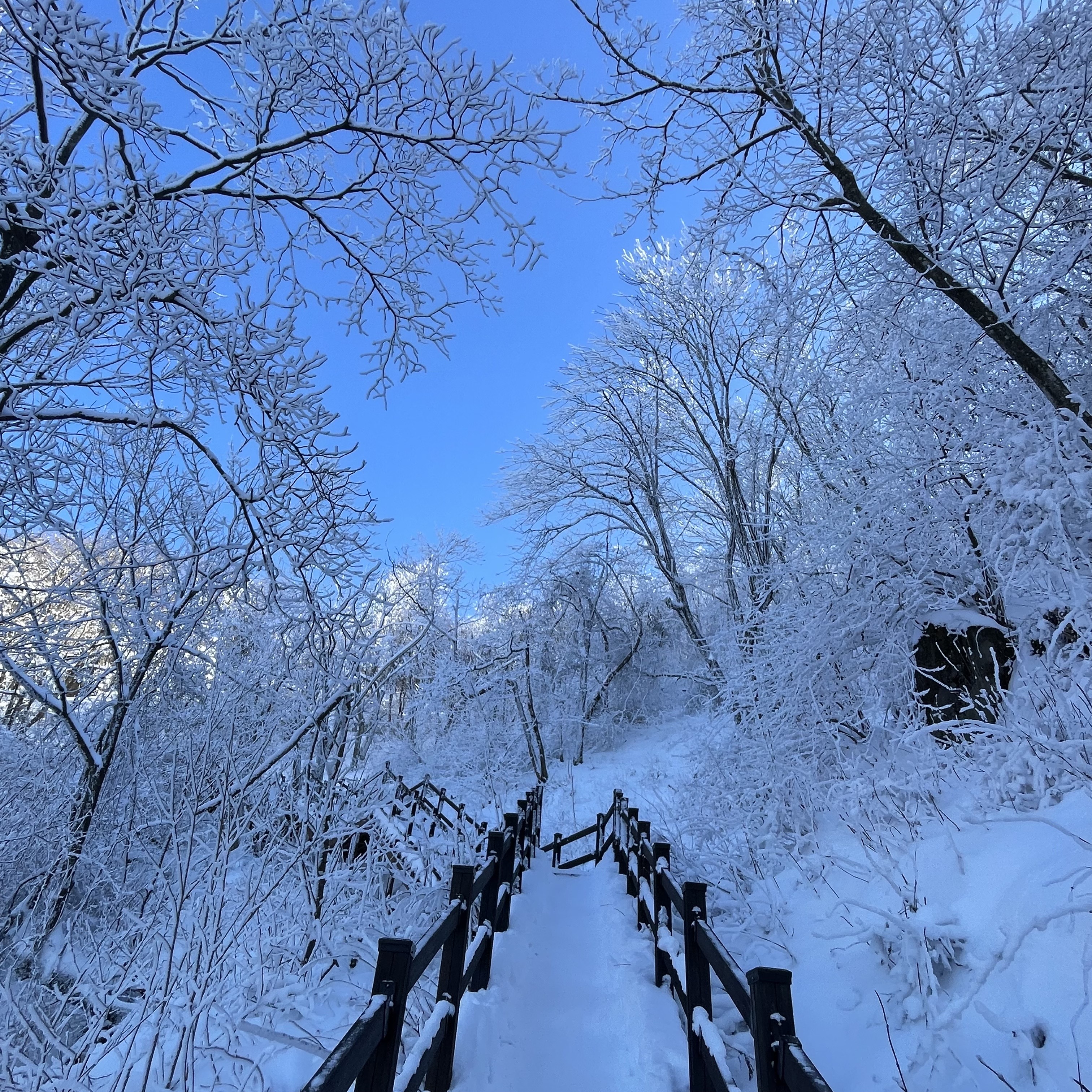 걷기좋은 임도길이 끝나면 본격적으로 등산로가 나옵니다. 민주지산은 1200이 넘는 산입니다. 지금부터는 경사가 상당합니다. 등산로마다 쌓인 눈들이 계단들을 모두 덮어버렸네요. 숨은 차오르지만 너무 멋진 설경에 황홀했습니다. 계단이 없어지니 내려올때는 미끄럼틀이 되어줍니다. 왕 재밌으니 민주지산에 몸을 맡기고 내려오세요 ㅎ
