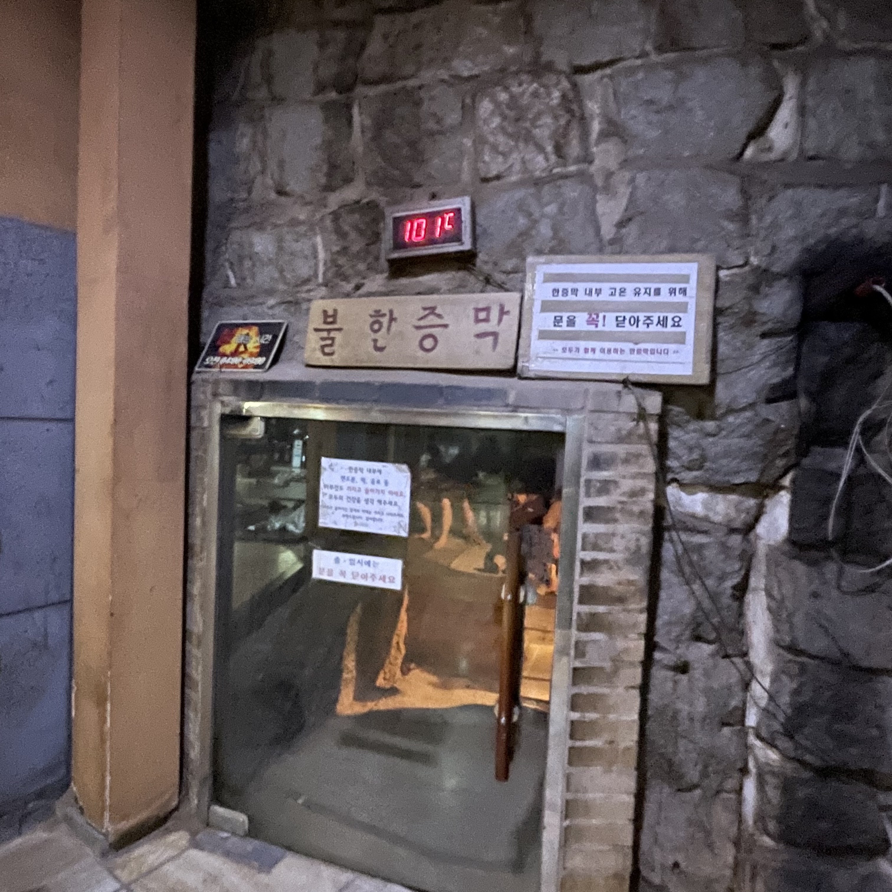 메인 불한증막은 사진에서 보이겠지만 101도!!! 정말 뜨겁습니다.~ 불한증막을 이용하실때는 수건으로 얼굴을 잘 감싸시세요~~ 그럼 좀더 버티기 쉽더라구요. 10분 정도 앉아 있으면 온 몸이 땀으로 젖어요! 한증원에서 긴 시간동안 이용하실 거라면 불한증막은 맨 마지막에 이용하시길 추천드려요. 찜질복이 땀에 흠뻑 젖으니까요~ㅎ