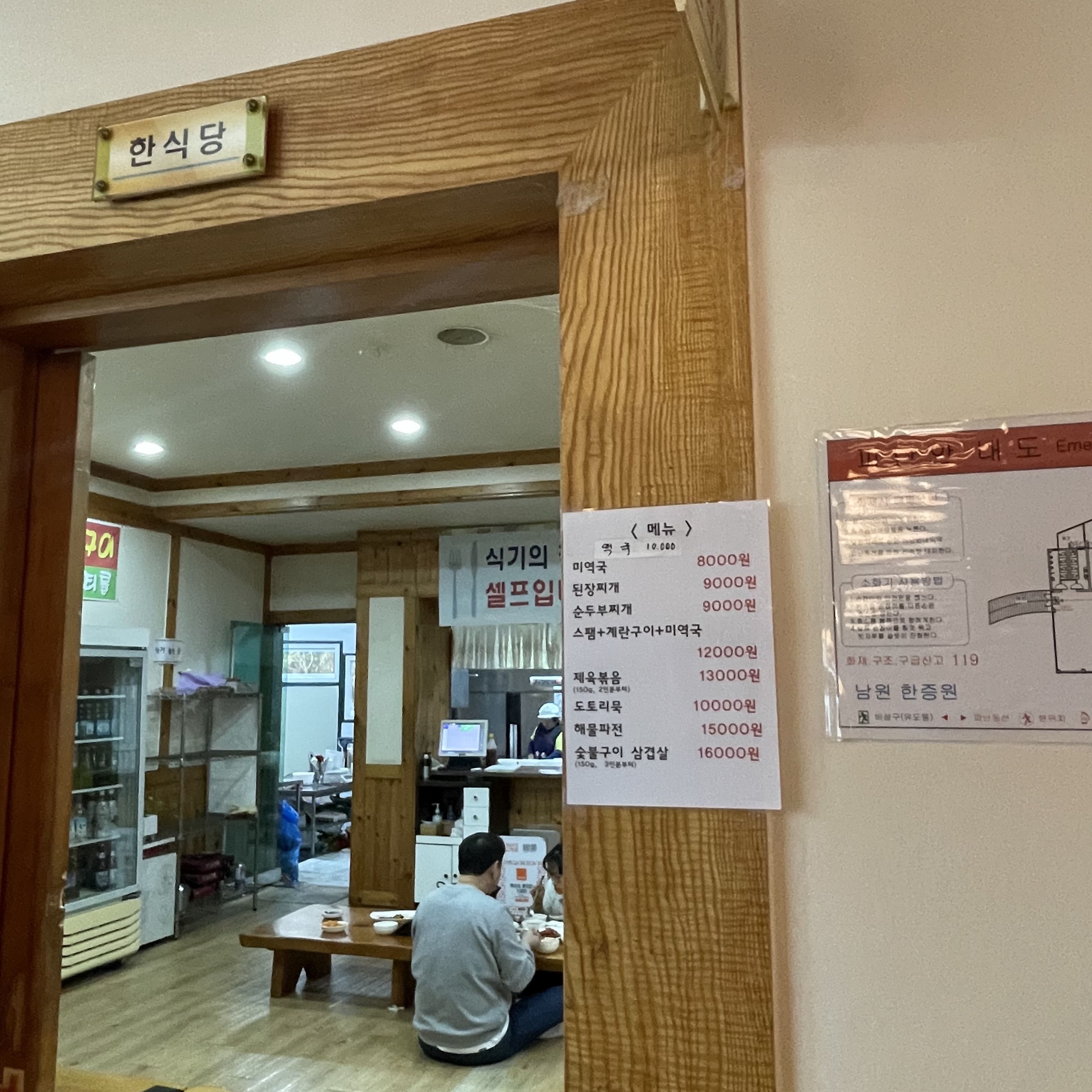 한증원내에 식사가 가능한 식당도 있어 소개해 드립니다. 가격은 크게 비싸지 않아요. 단... 맛은.... 저희는 미역국과 순두부찌개를 주문해 먹었는데.... 짝꿍은 미역이 많아서 자기스타일이라고 하더라구요. 저의 순두부는... 너무 맹맛?! ㅎㅎ 그냥 그렇더라구요..ㅎㅎ 재밌는 점은 식당 내 삼겹살을 구워먹는 장소가 별도 있다는 점!! 고기를 싸와서 숯불에 구워먹을 수가 있답니다.!! 신박한 시스템!! ㅎㅎ