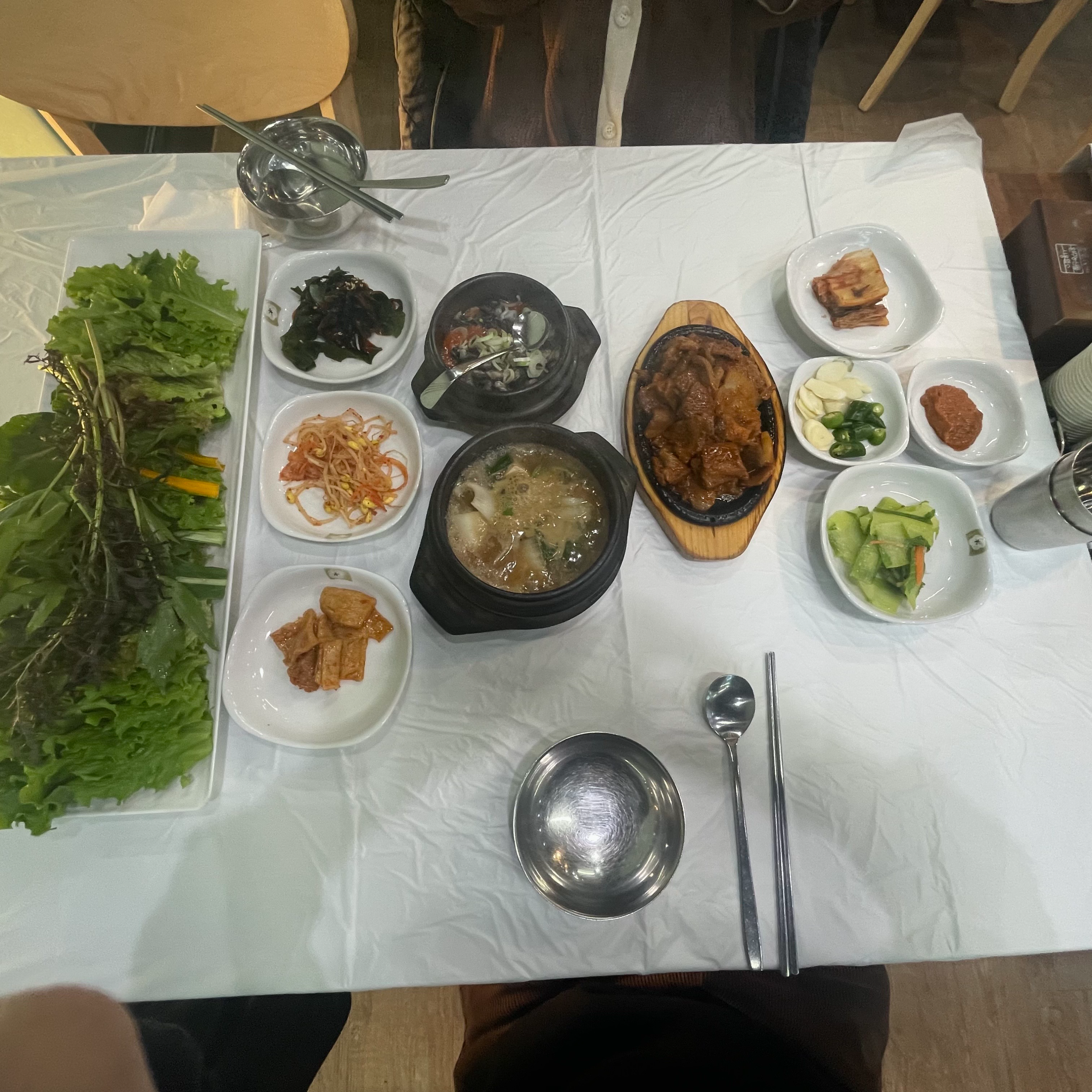 저희는 제육 쌈밥 2인분을 주문했어요. 두툼한 고기의 제육과 우렁강된장, 우렁 된장찌개를 중심으로 밑반찬들이 호위하고 있습니다. 그리고 상 한쪽을 차지하고 있는 다양하고 싱싱한 쌈채소들이 보이시나여? 이곳을 많은 분들이 방문하는 이유는 저 싱싱하고 다양한 쌈채를 맛보기 위해서 입니다.