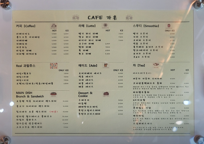 '카페 가온'은 브런치카페로 간단히 배를 채울 수 있는 메뉴와 기본적인 카페 음료들을 판매하고 있습니다. 아메리카노 기준 5,500원/ 6,000원으로 저렴하지는 않지만 주변 풍경을 즐길 수 있는 값이라 생각합니다.