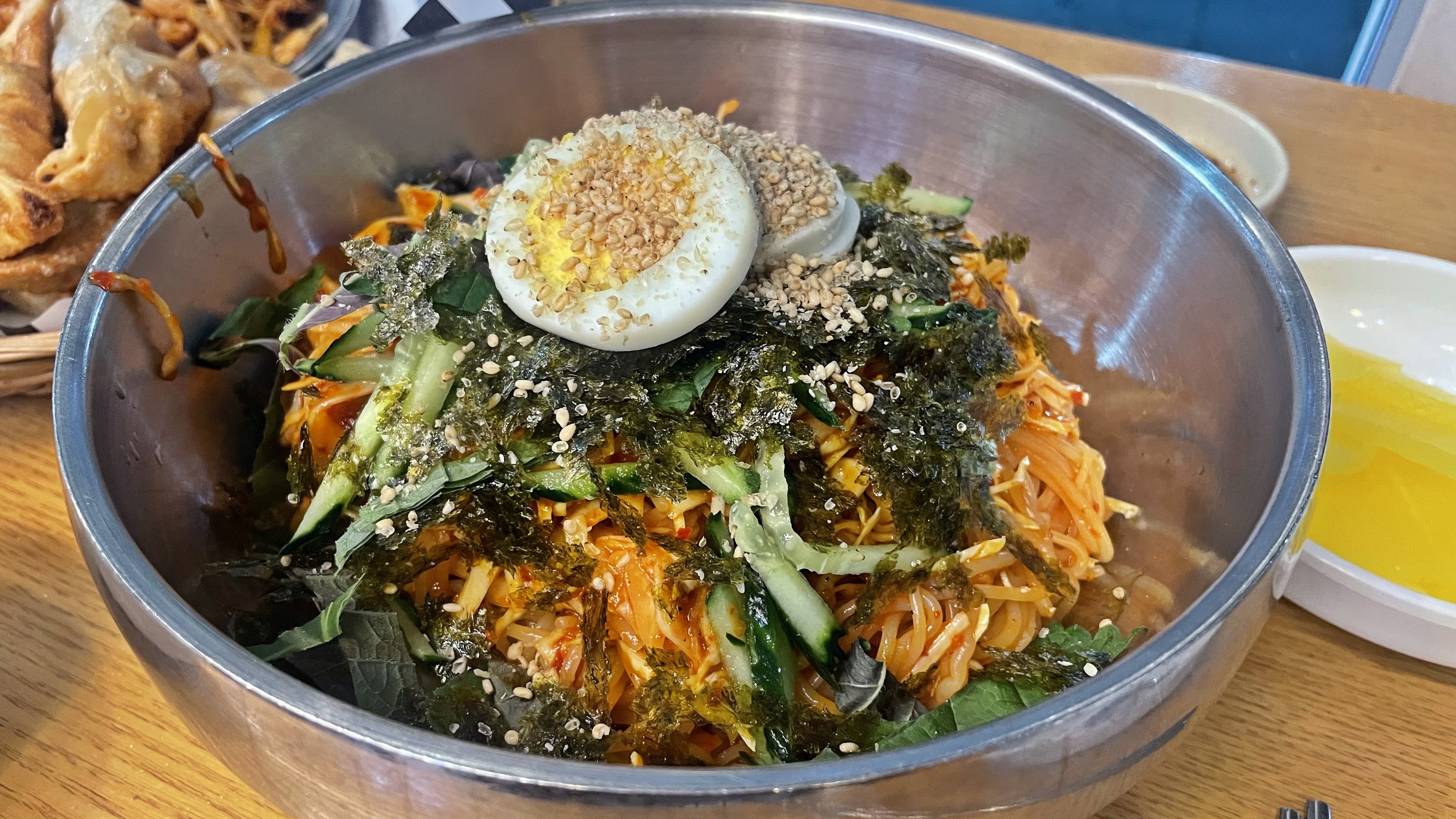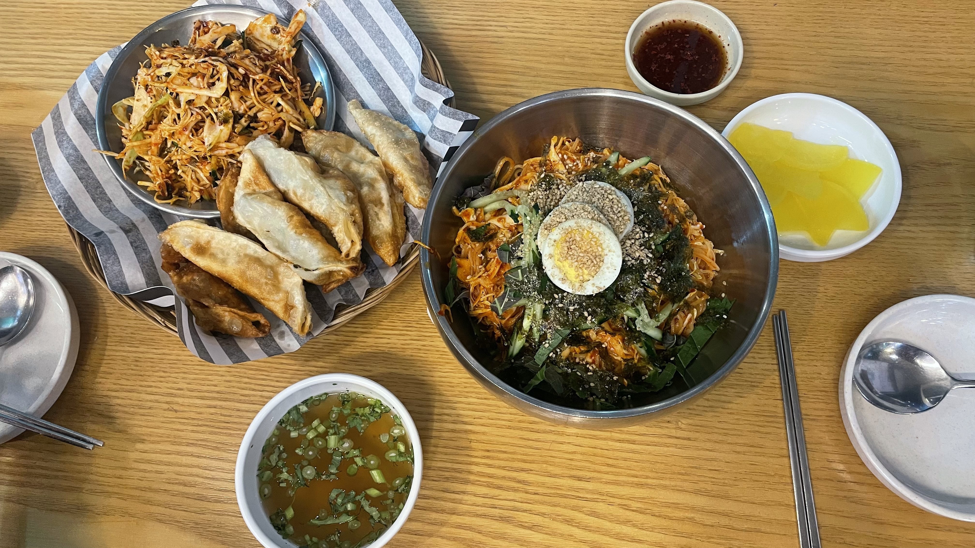 저희가 주문한 비빔만두와 쫄면입니다. 만둣국과 고민끝에 주문한 쫄면인데 비빔만두의 양념과 비슷해 보여서 조금 아쉬웠습니다. 만둣국을 주문하는게 조합이 더 좋을 것 같네요. 실제로 비빔만두의 야체는 쫄면보다 조금더 간이 강한 맛이었습니다.