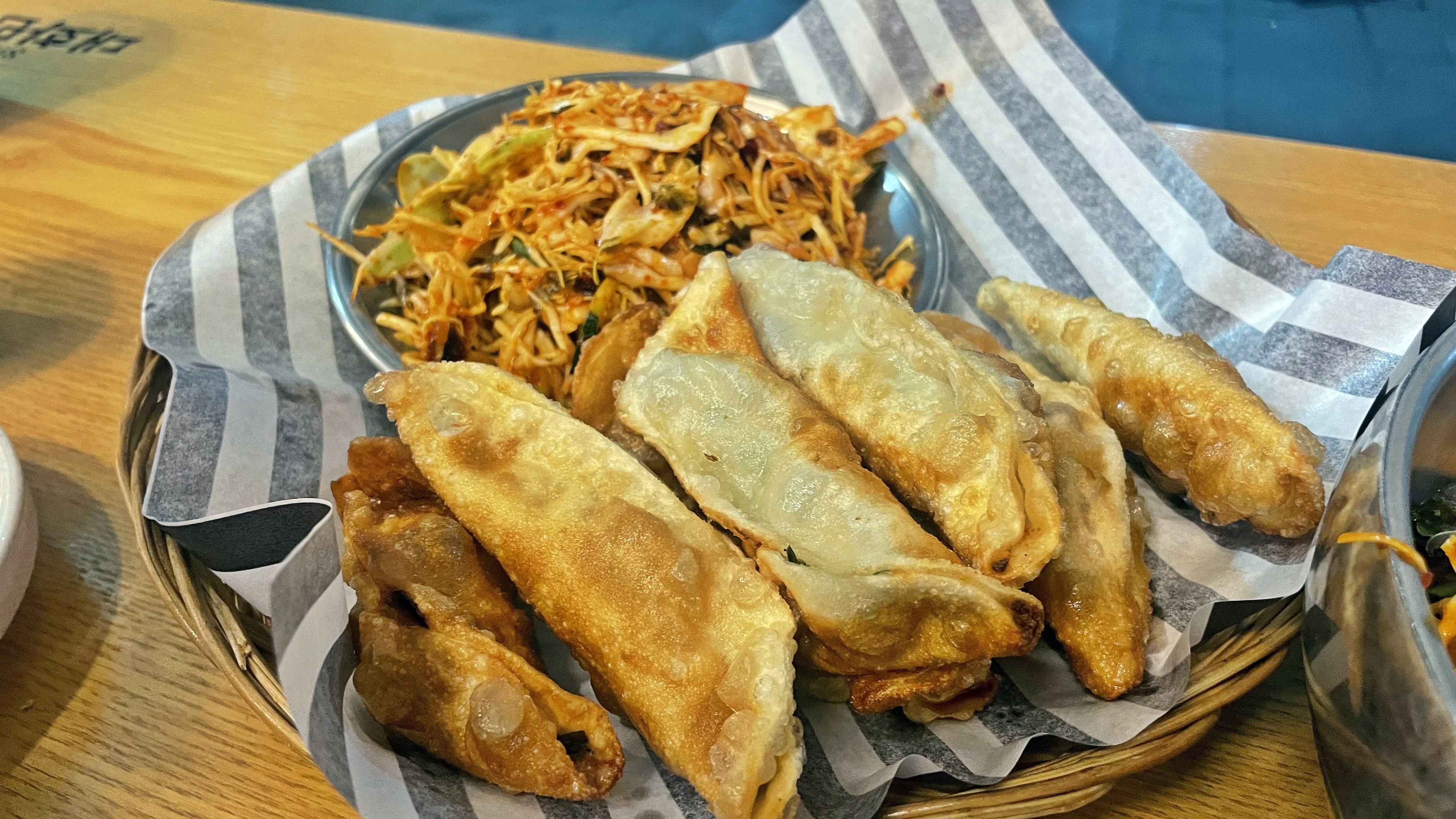 대화 만두의 비빔만두입니다. 겉바속초의 공식을 충실히 따르고 있는 군만두들이었어요. 중국집의 군만두와 비슷했습니다. 바삭하게 튀겨진 겉면과 씹으면 육즙이 있는 고깃속이 있습니다. 여기에 매콤 새콤한 야채와 함께 드시면 느끼함 없이 만두에 계속 손이 가게 됩니다.