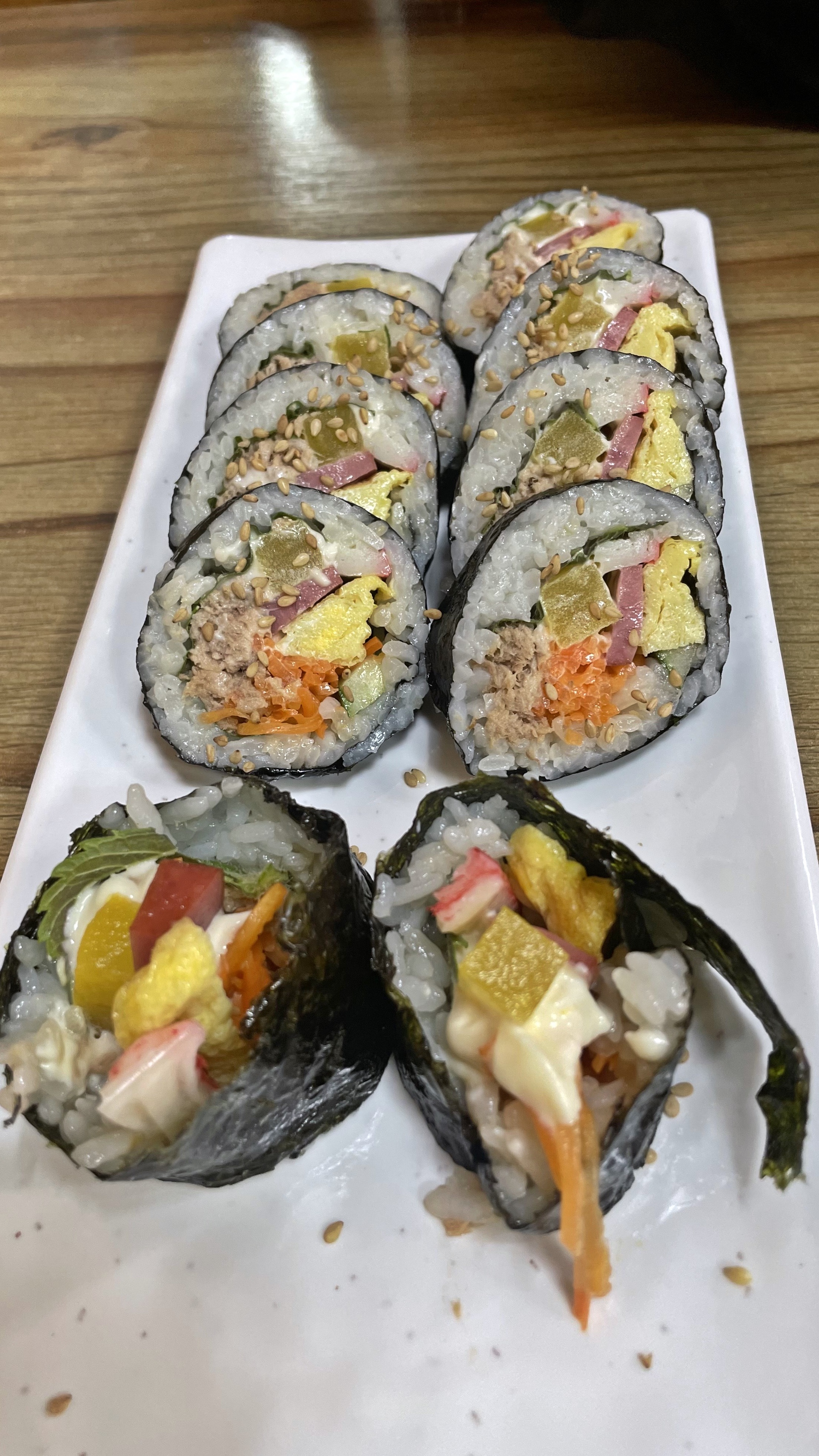 그리고 이곳에서 칼국수, 수제비 만큼이나 인기가 많은 김밥입니다. 그 중에서도 참치김밥이 정말 맛나더라구요. 참치에 마요네즈 양념, 깻잎이 함께 들어가 있는 기본에 충실한 참치 김밥입니다. 특별한게 없이 기본에 충실한 참치김밥이라 더 좋더라구요. 수제비 칼국수와 함께 김밥 한 줄 함께 드시면 정말 든든한 한끼가 됩니다.