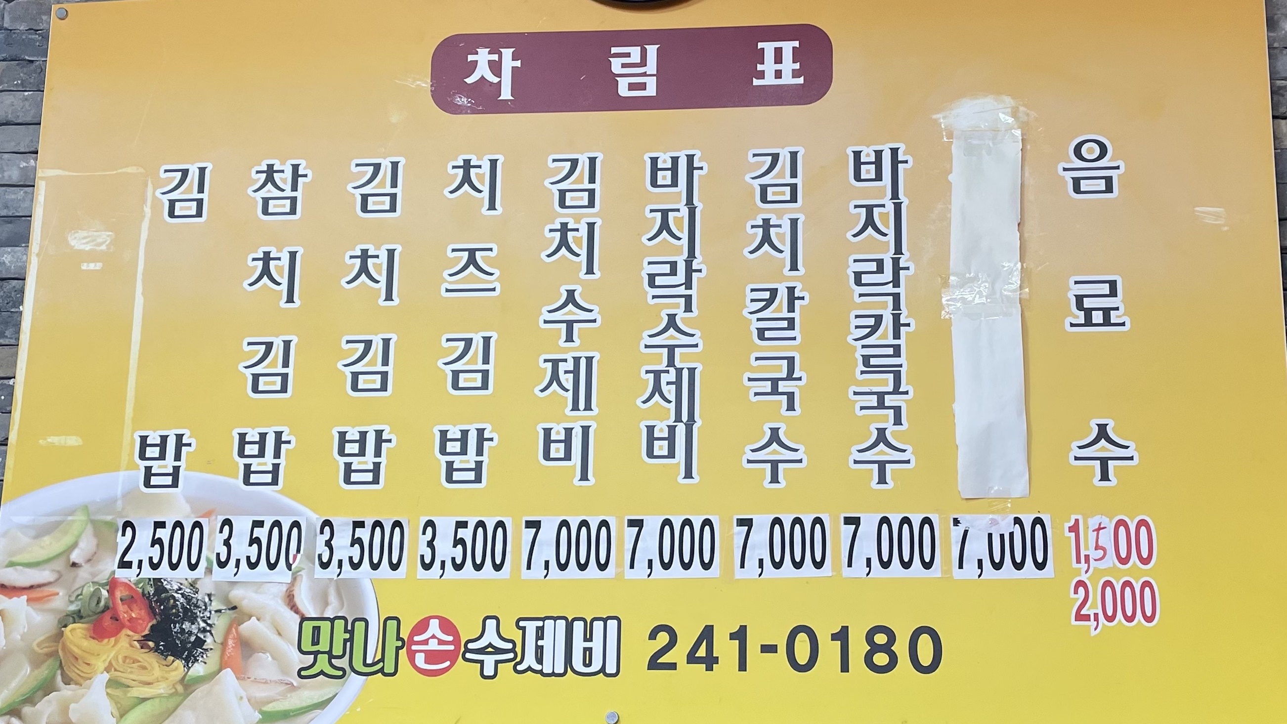맛집답게 메뉴구성이 다양하지 않습니다. 김밥(참치, 김치, 치즈), 수제비(김치, 바지락), 칼국수(김치, 바지락)... 끝.!! 좁은 길에 위치하고 있는 그저 평범해 보이는 가게같이 보이지만 식사시간때 방문해보면 자리를 차지하고 있는 수많은 사람들이 맛나 손수제비의 맛을 말해주는 곳입니다. 맛나 손수제비는 상호명에서 알 수 있듯이 수제비가 대표에요. 김치와 바지락 수제비를 파는데 제 개인적인 취향으로는 바지락수제비가 완승!!