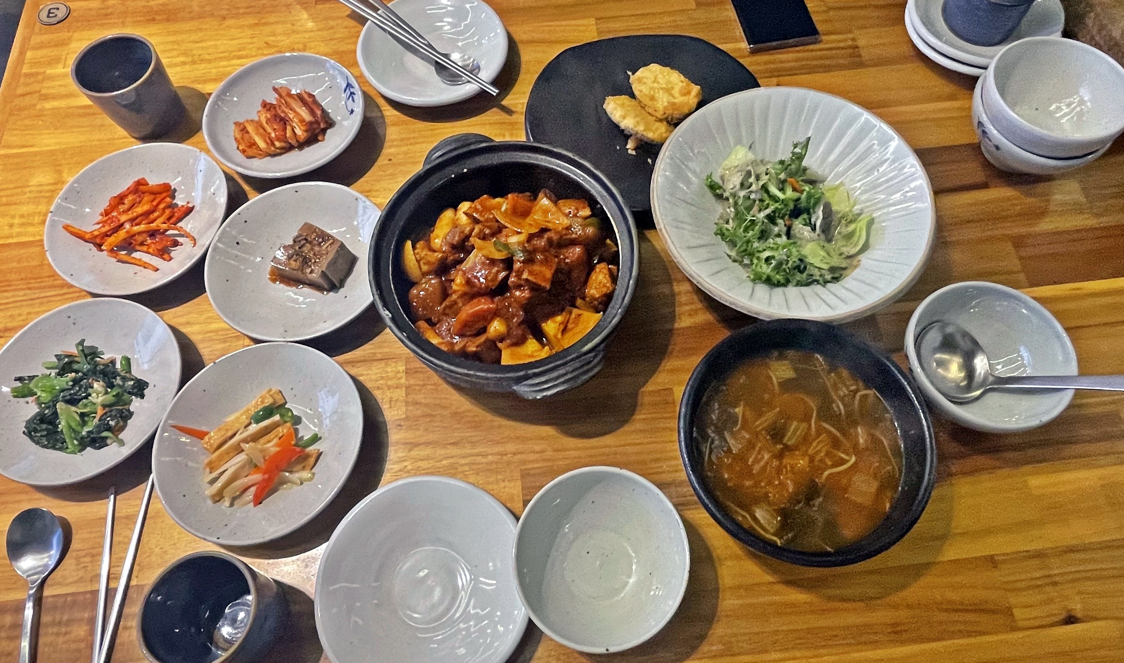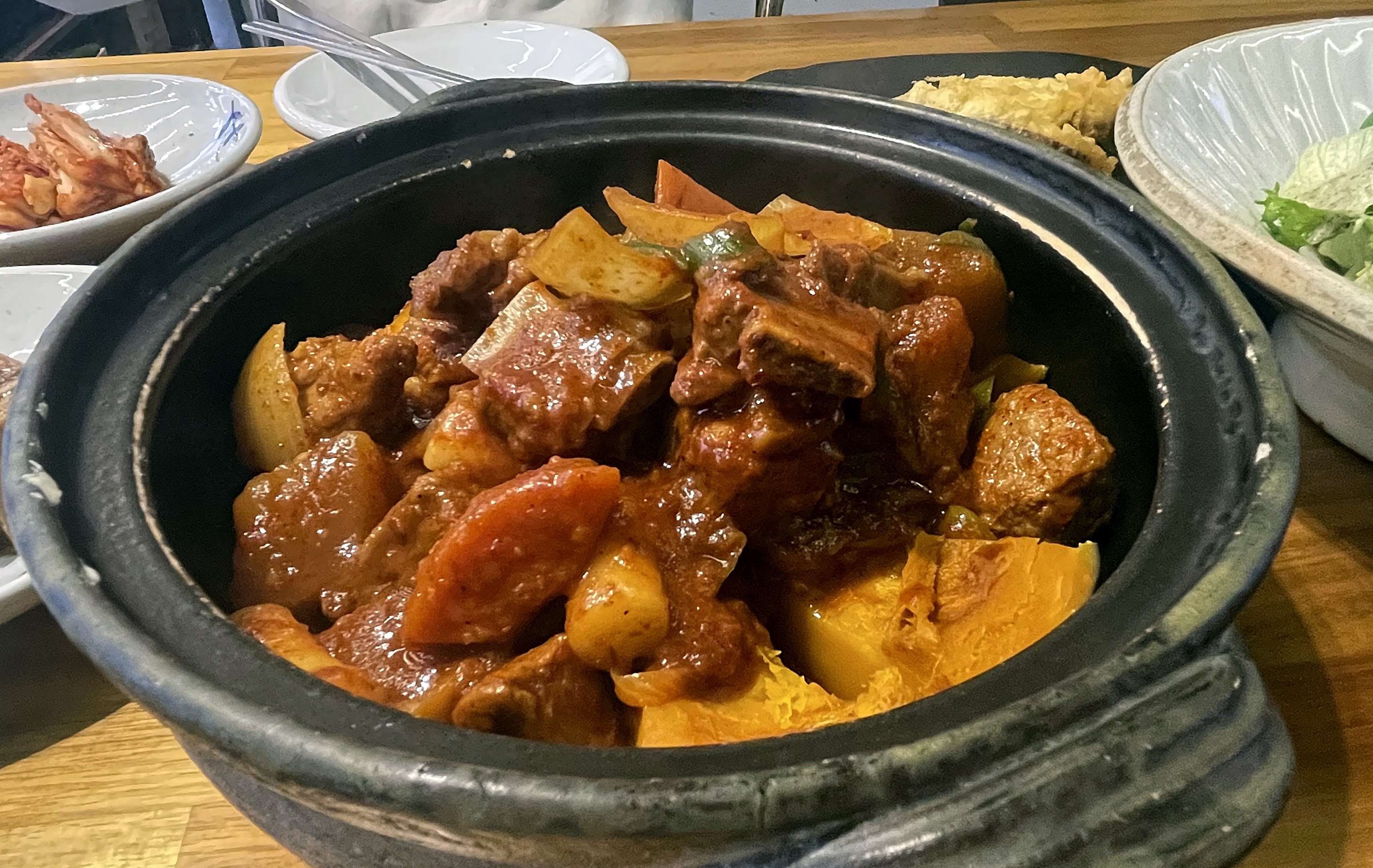 그럼 저희가 주문한 단호박매운갈비찜을 살펴볼게요. 정말 정갈한 한 상이죠? 주의할 점은 매운갈비찜에는 공기밥이 별도입니다. 저희도 처음엔 모르고 있다가 나중에서야 주문해서 밥에 먹었네요.