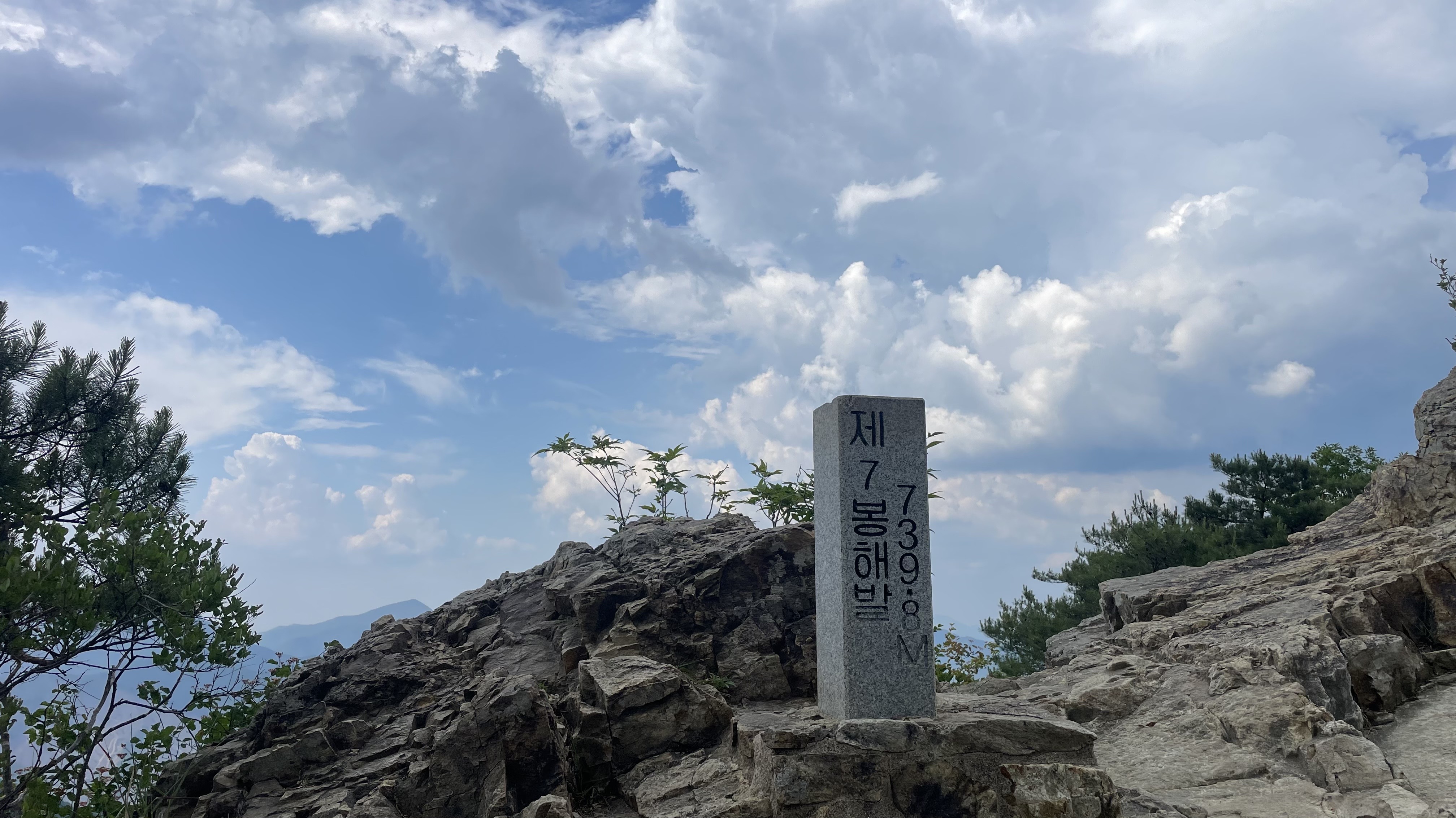 계단길을 쭈욱 오르면 드디어 1봉의 표지판이 나옵니다. 여기서 1봉은 그냥 제끼겠다 하시는 분들은 바로 정상쪽으로 가시면 2봉을 만나볼 수 있어요. 100미터 정도만 가면 1봉이 나오니 1봉을 찍고 구봉산에서 바라보는 첫 번째 전경을 감상해보시기를 추천드려요.^^