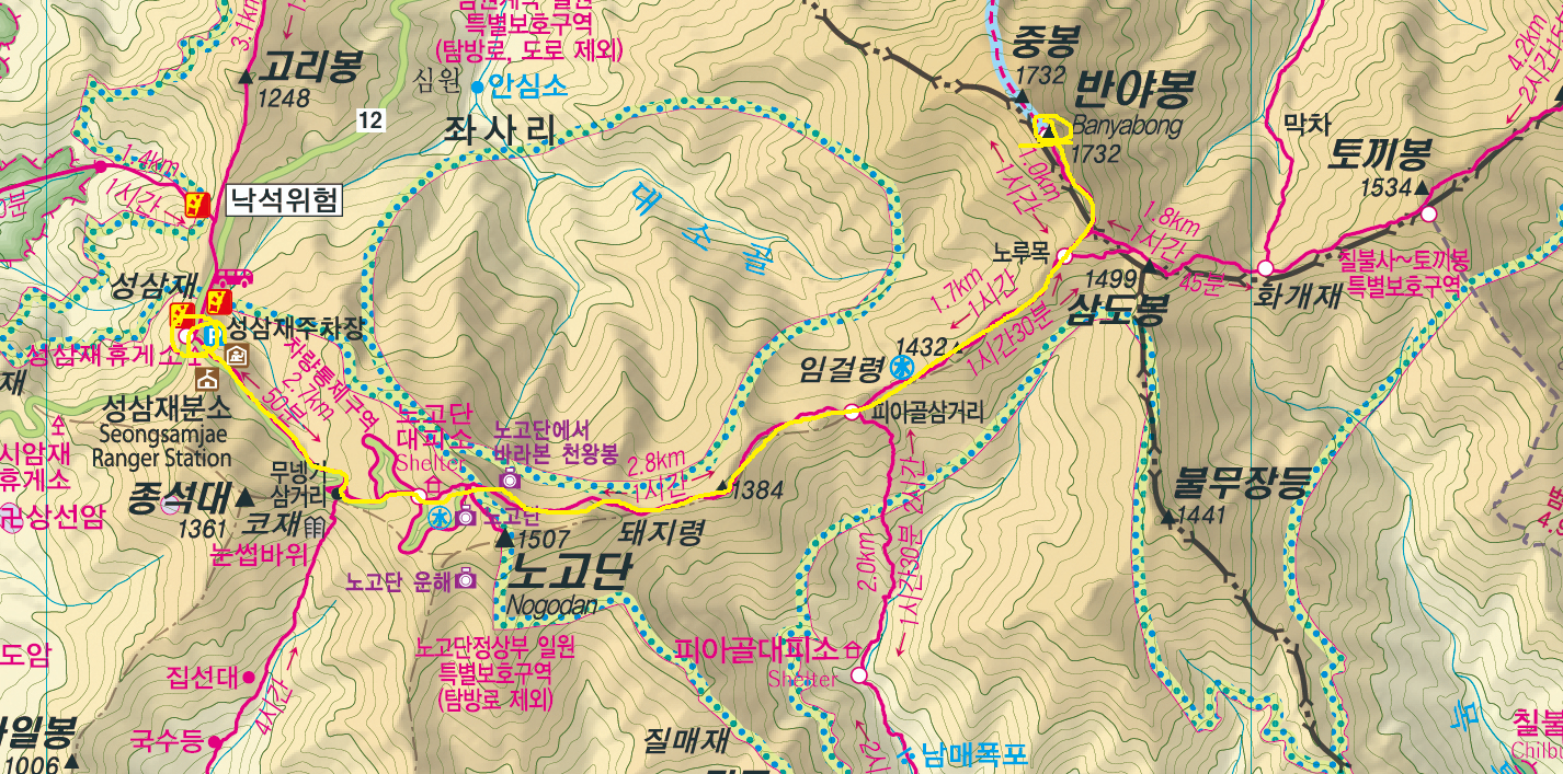 | ◈ 지리산 반야봉 최단코스 안내 ◈ ▶ 왕복 총 거리: 약 17km ▶ 높이: 1732m ( 실제 등산 높이는 975m) ▶ 시간(왕복): 등산고수 - 5~6시간 , 등산 초보 및 체력 허약자 - 7~8시간 ▶ 최단코스: 성삼재 휴게소 주차장 - 노고단고개 - 임걸령 - 노루목 - 반야봉 - 원점회 ▶ 주차: 성삼재주차장(전남 구례군 산동면 노고단로 1068) ▶ 주차비: 중소형 기준 최초1시간 1,100원 // 1시간 이후 10분당 300원 -- 대형차는 딱 두배 ▶ 화장실: 등반 초기 성삼재 휴게소 및 노고단 대피소에 있음.! 이후 반야봉까진 없으니 꼭 속 비워두고 시작하시길.. ▶ 산행 준비물: 충분한 음료 및 간식, 긴 산행이기에 간단한 식사, 모자 ▶ 특징: 성삼재 - 반야봉 코스에서 인증할 수 있는 BAC 인증지 BAC 라운지 투어: 성삼재 BAC 라운지에서 진행 백두대간: 노고단고개 출입문 명산100+: 노고단 정상 명산 100: 바래봉 정상 노고단 정상까지 방문하실 분들은 노고단은 예약탐방제로 예약을 통해서만 입장가능하니 이 점 꼭 기억!! <<<<<지리산 노고단 탐방 예약하러 가기!!>>> ![]() 등반 Tip!!!. 마지막 노루목에서 반야봉까지의 경사가 제일 힘든 구간이므로 구간 중간의 쉼터에 배낭을 두고 다녀오시면 조금이나마 편함!!! 최단코스: 노란라인 |