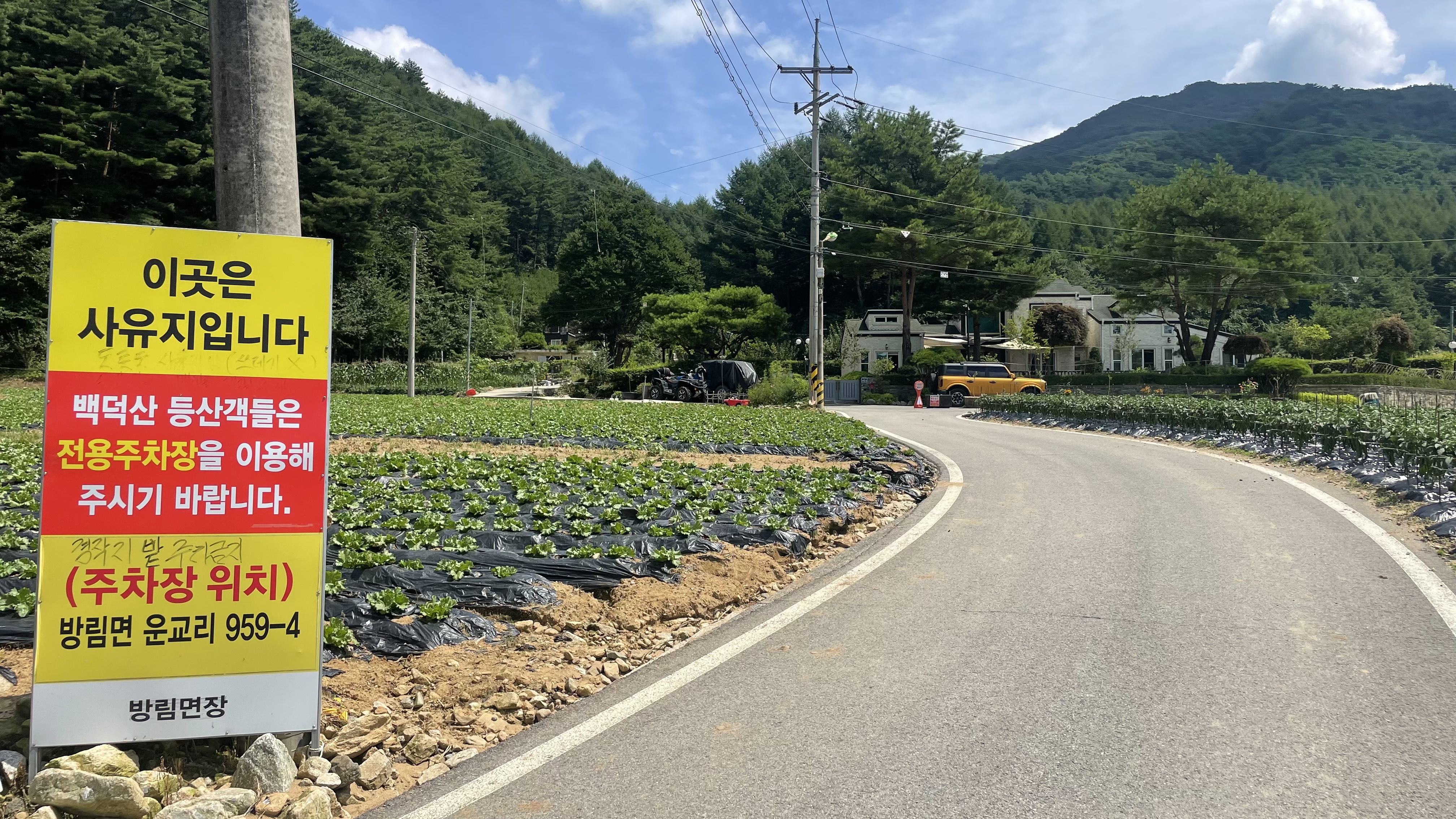 마을회관 주차장에서 등산로 입구까지 약 1km정도 되는 거리를 이동하시면 됩니다. 가능 길목 길목 등산객들의 차량 진입을 하지 말아달라는 마을 분들의 표지판을 보며 그동안 무분별한 주차때문에 힘드셨을 마음이 전해져 옵니다.