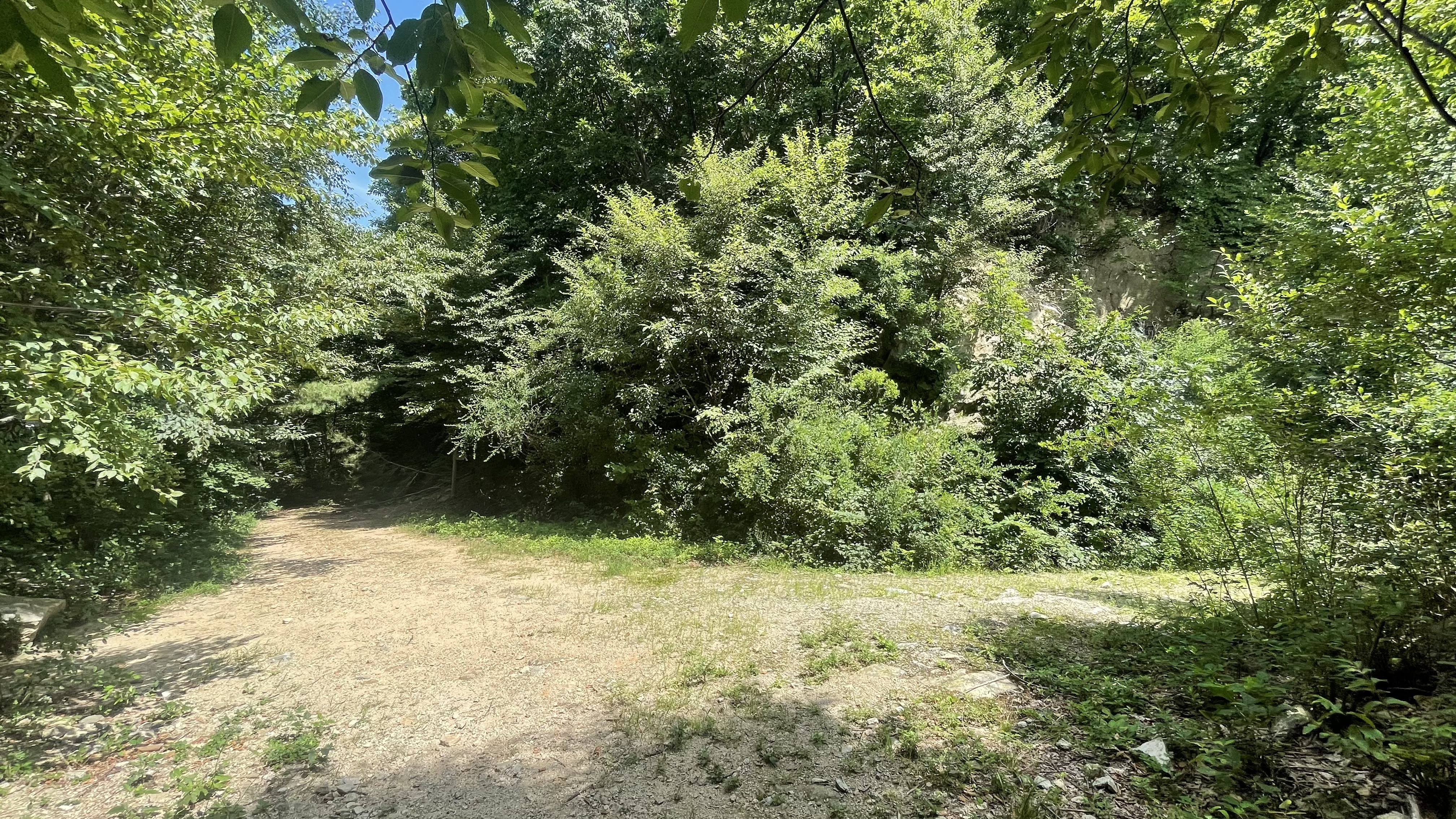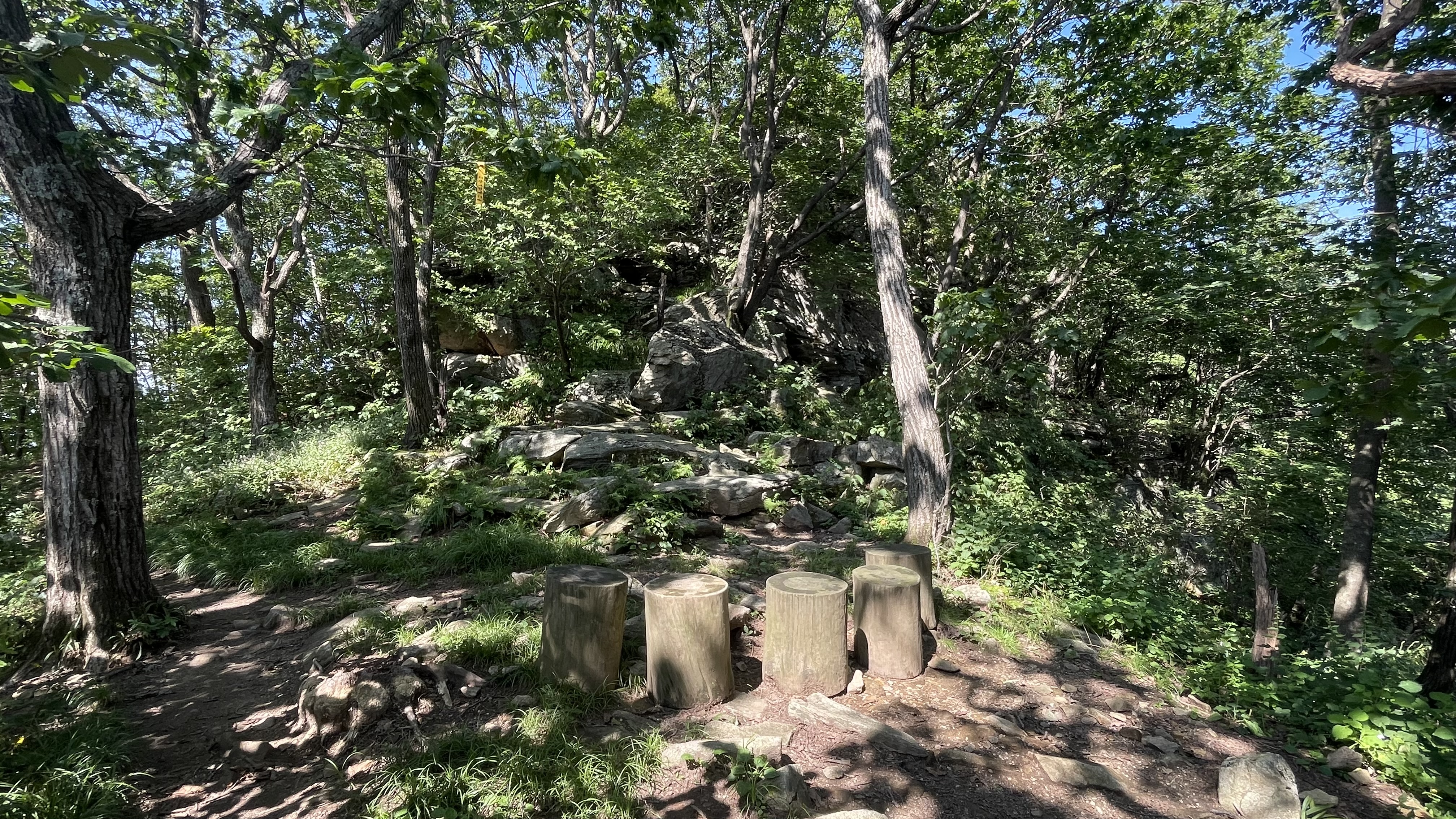 이제부터 1.5km 구간은 가파른 오르막길입니다. 정상까지 가는 구간 중 가장 힘든 구간이 될 수 있습니다. 다행히 활엽수들도 가득한 산길이기에 뜨거운 태양은 피할 수 있습니다. 다만, 파리들이 왜이리 많은 걸까요? 주변에 버섯들이 워낙 많아 파리가 많은것 같기도 합니다. 열심히 오르다 보면 임도길이 갑자기 똬악 하고 나오는데 여기서 이게 맞나 싶은 길을 통해 다시 등산로를 탑니다. 아래의 표지판을 믿고 들어가시면 됩니다.