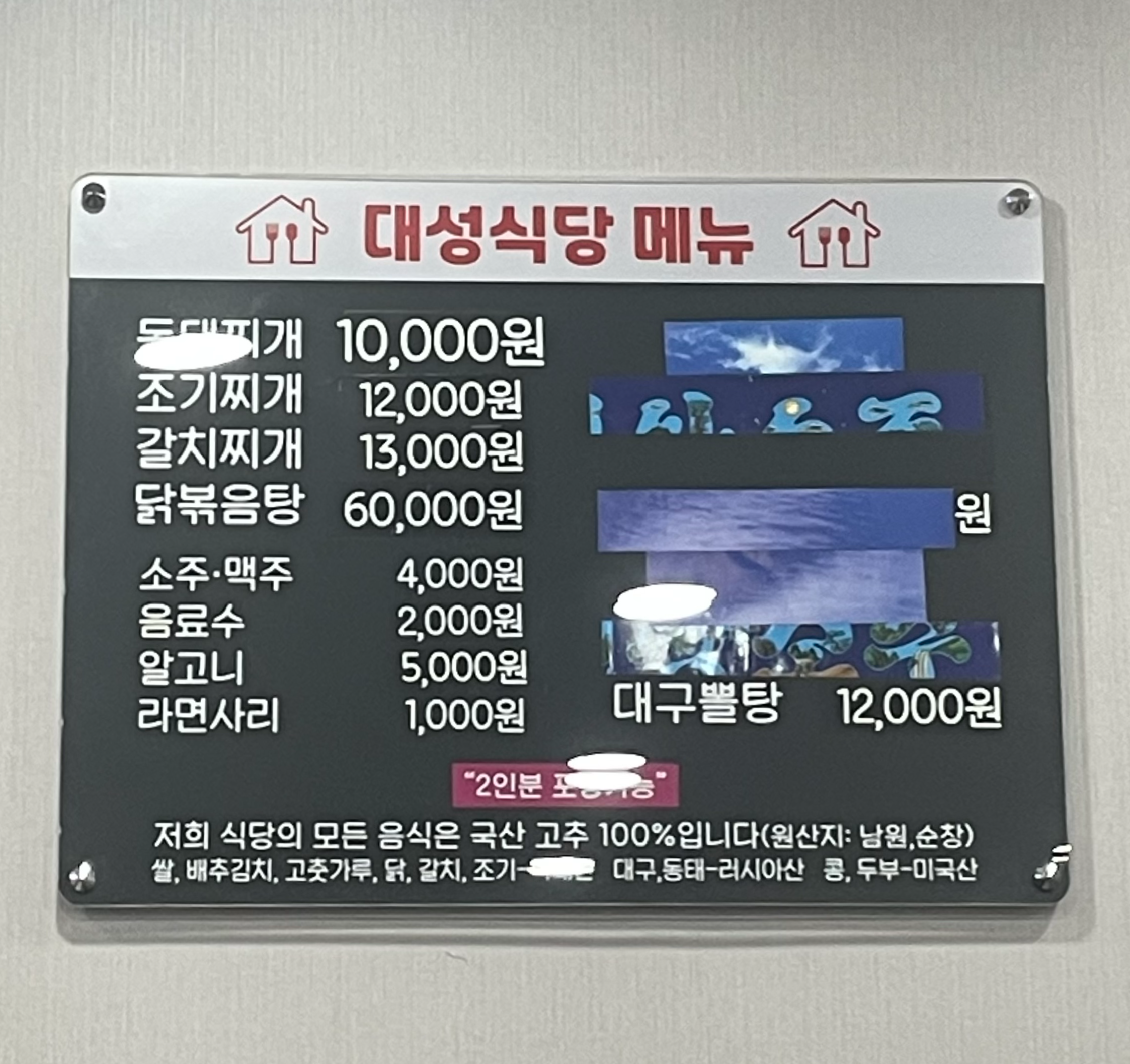 위 메뉴를 보시면 아시겠지만 대성식당에서는 고추, 쌀, 배추김치, 고춧가루, 갈치, 조기 등 모두 국산을 쓰는 음식점입니다. 밑반찬 하나하나 정성스레 만든 음식이란게 확 느껴지는 곳입니다. 밑받찬들도 그 때 그 때 계절에 따라 변하더라구요. 저는 동태찌개가 끓는 동안 밑반찬으로만 반공기 이상을 먹게 되는 곳입니다.