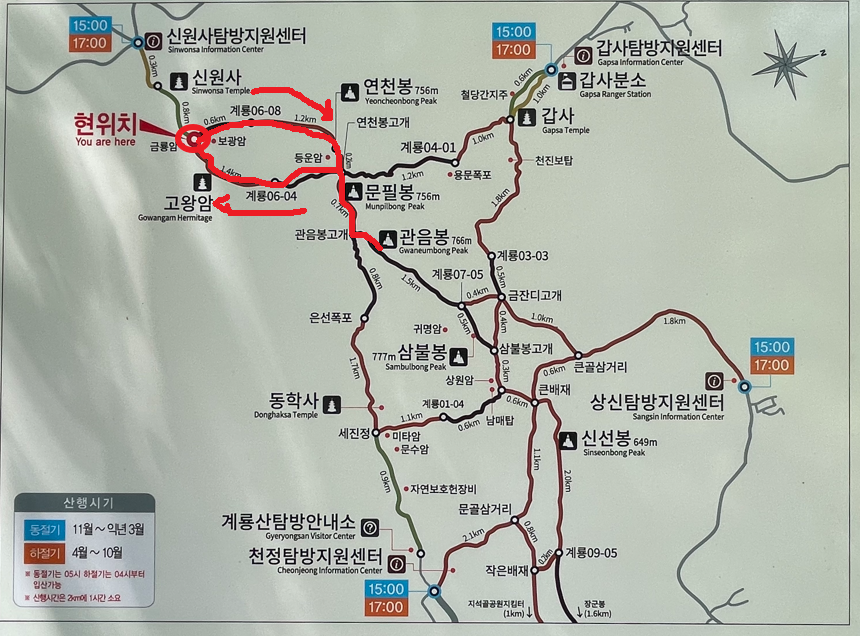 최단코스: 빨간라인(연천봉쪽 등산  - 고왕암쪽 하산)