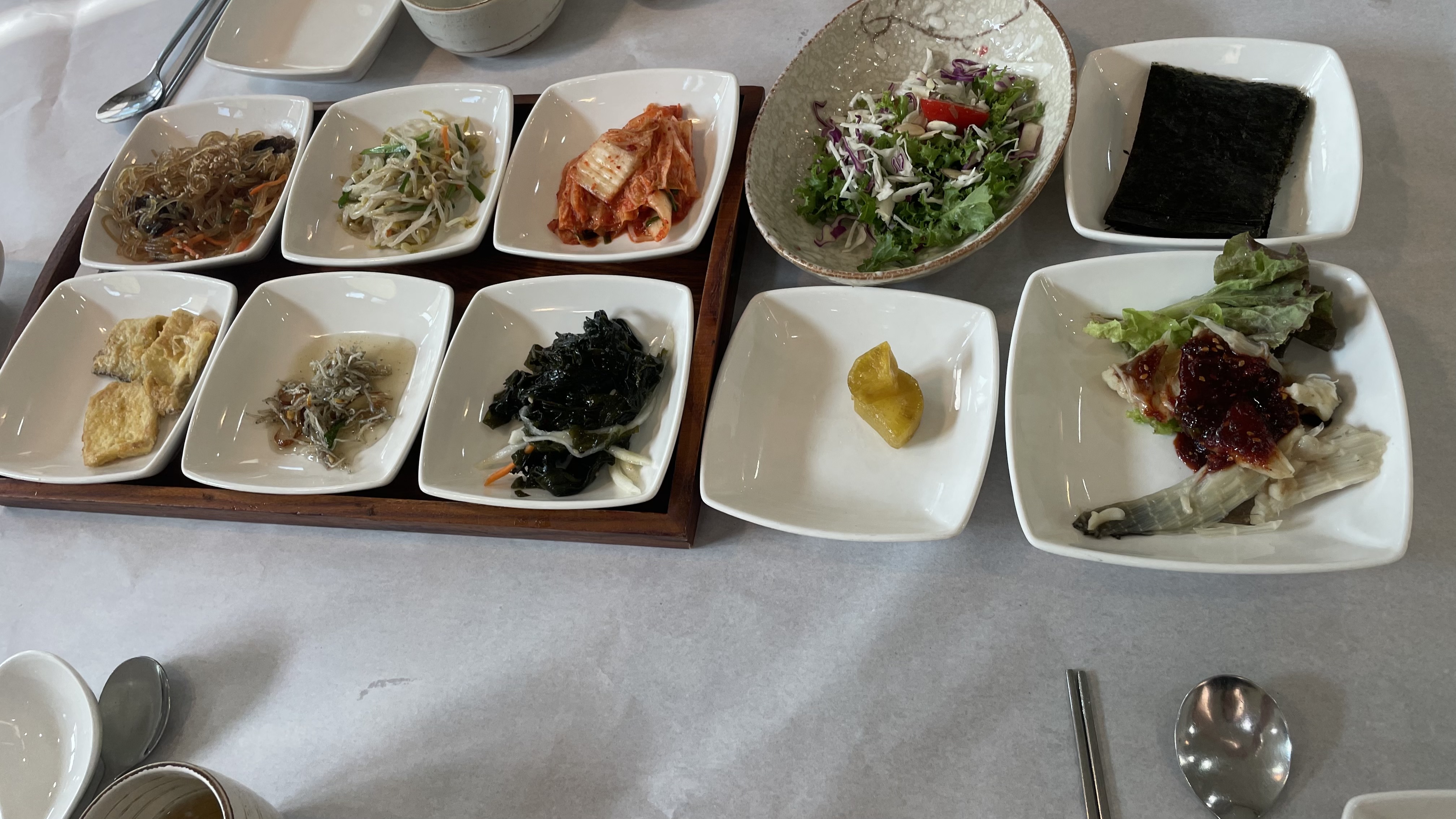 뒤이어 잡채,숙주나물, 김치, 샐러드, 김, 홍어찜, 고구마맛탕, 미역, 멸치, 버섯전
