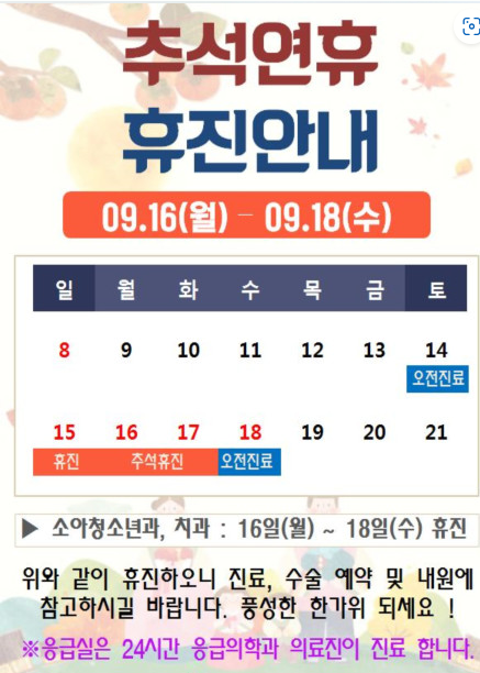 ▶ 추석연휴 진료안내: 14~18일 24시 응급실 운영