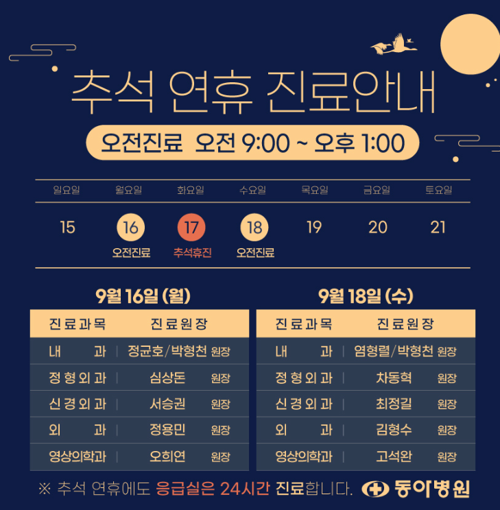 ▶ 추석연휴 진료안내: 14~18일 응급실 운영 // 달빛어린이 진료 14~ 18일 18:00 - 23:30