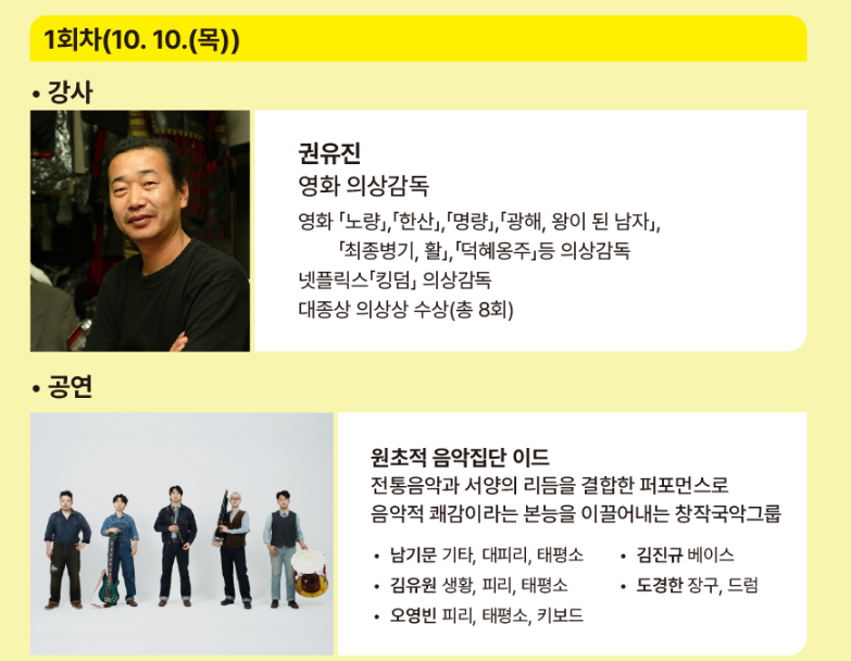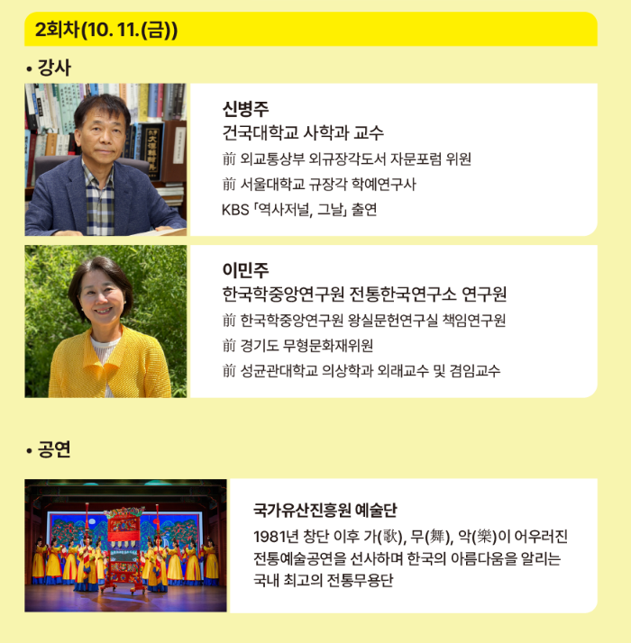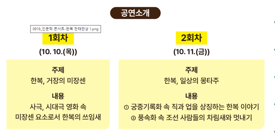 우리나라 전통 의상 한복에 관해 두 가지 주제로 인문학 콘서트가 열립니다. 1회차에는 영화 '노량' , '한산', '명량', '최봉병기, 활', '덕혜옹주' 등의 의상감독을 맡은 권유진 감독과의 영화 속 한복에 대해 이야기가 이루어지며, 2회차에는 신병주 교수와 이민주 전통한국연구소 연구원과 함께 전통 의상 한복에 대해 이야기가 이루어 집니다.