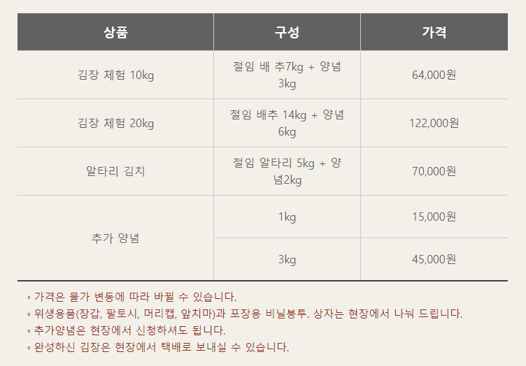 : 참가비는 10kg, 20kg, 알타리 김치로 구성되며 참가비는 하단의 표와 같습니다.