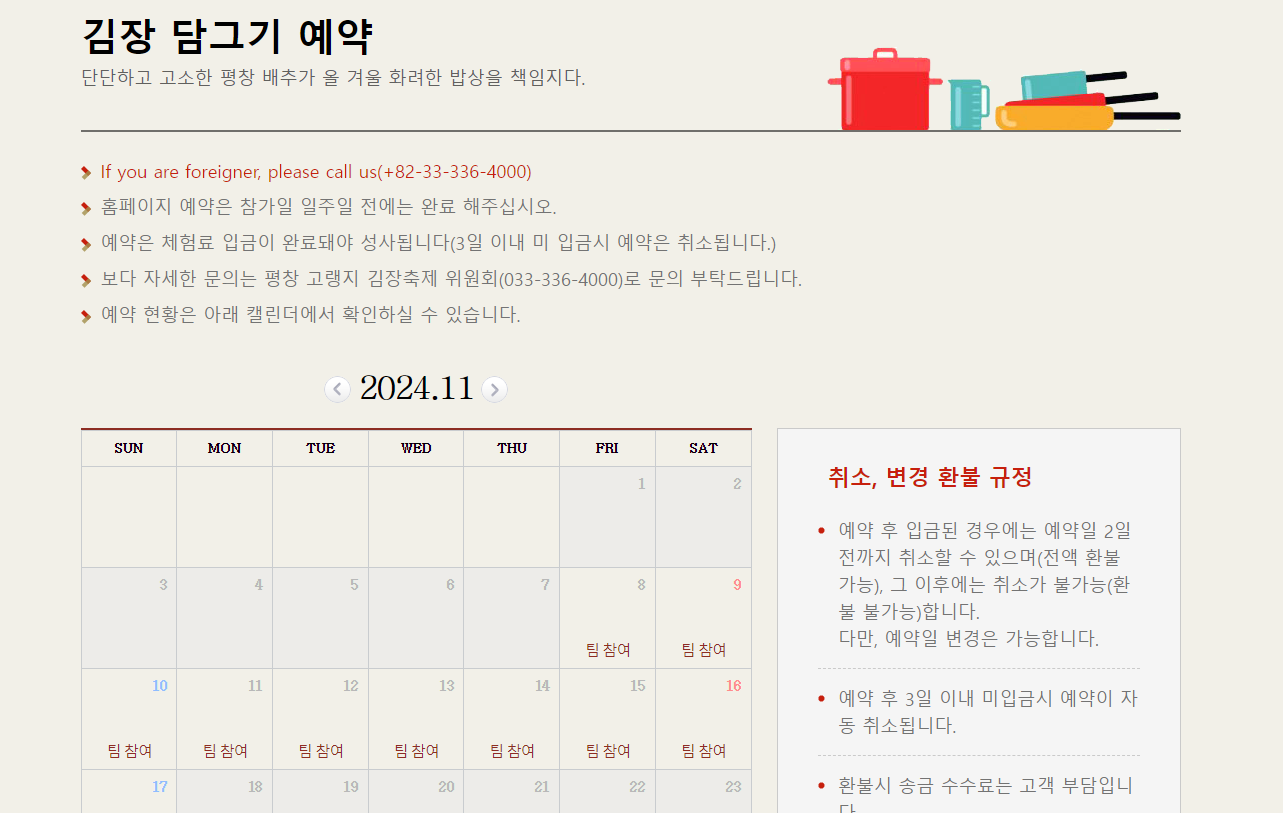 아래의 버튼을 클릭하시면 하단의 김장 담그기 체험 예약 사이트로 바로 이동가능합니다.