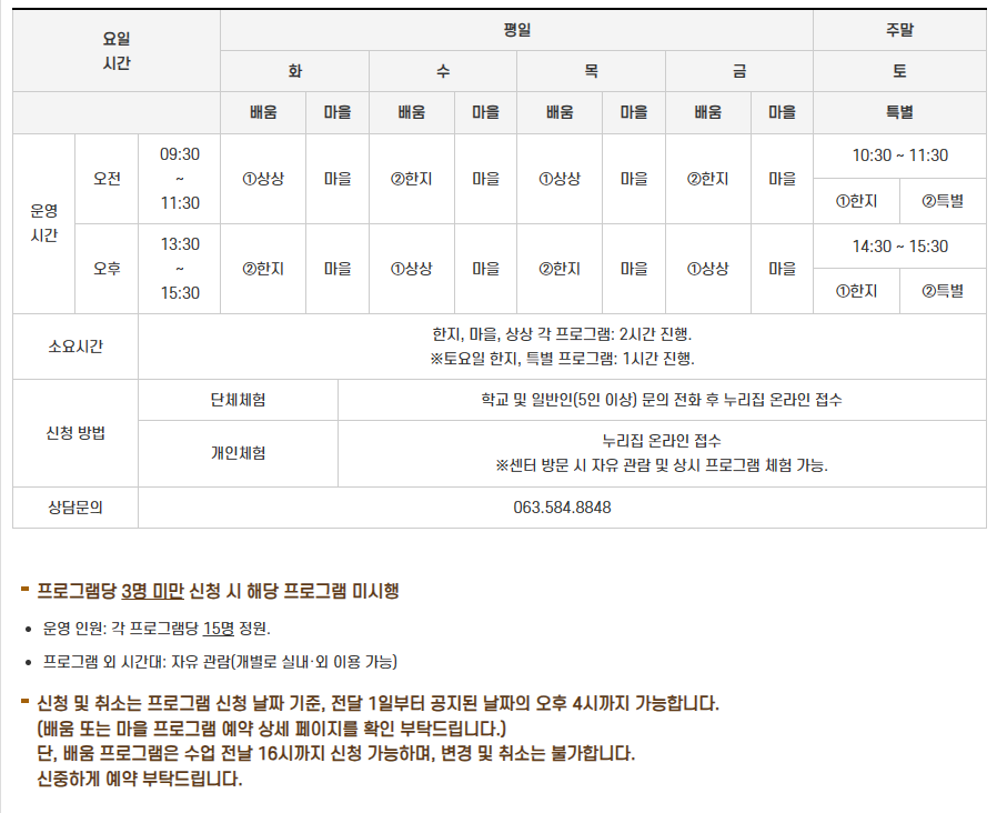 아래 운영시간표를 보시면 알겠지만 오전 오후 두번 체험이 이루어 집니다. 두번 모두 각각 다른 프로그램으로 신청이 가능(오전1, 오후1)하다고 하니 한지와 특별프로그램 모두 이용해 봅시다~!!