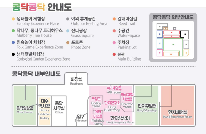 닥나무한지체험관 '콩닥콩닥'은 아이들을 위한 다양한 체험장들이 준비되어 있습니다. 아이들이 자연을 즐길 수 있는 야외 시설들 뿐만 아니라 실내에서 사전예약을 통해 재미있는 체험들을 즐길 수 있으니 요즘같이 좋은 날씨에 야외에서 즐거운 시간을 보내고 예약한 시간에 실내에 가서 체험프로그램에 참여한다면 재밌고 유익한 하루를 보낼 수 있겠죠?