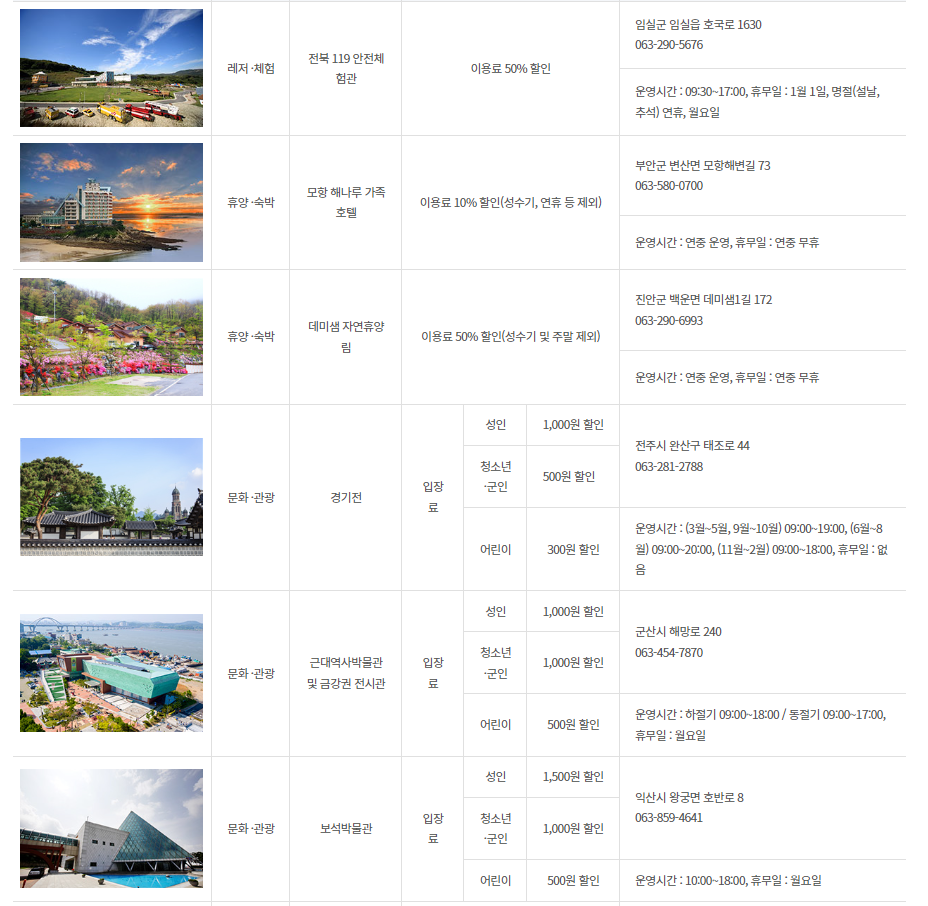 - 50% 할인: 전북119안전체험관, 진안 데미샘 자연휴양림, 남원 백두대간 생태 교육장 전시관, 지리산 허브밸리, 순창 발효소스토굴, 순창 푸드사이언스관, 순창 미생물뮤지엄, 부안 청림천문대, 부안 청자박물관