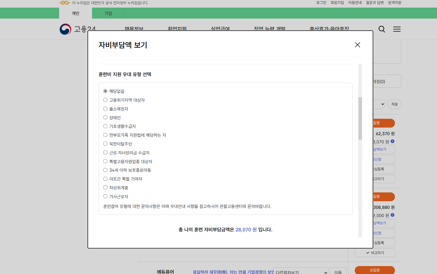 그렇다고 전액 지원을 받을 수 있는 건 아닙니다. 대상에 따라 45% ~ 100%까지 지원비가 다르니 해당 훈련과정을 검색하시어 자비부담금액을 산출해보시면 정확히 알 수 있습니다.