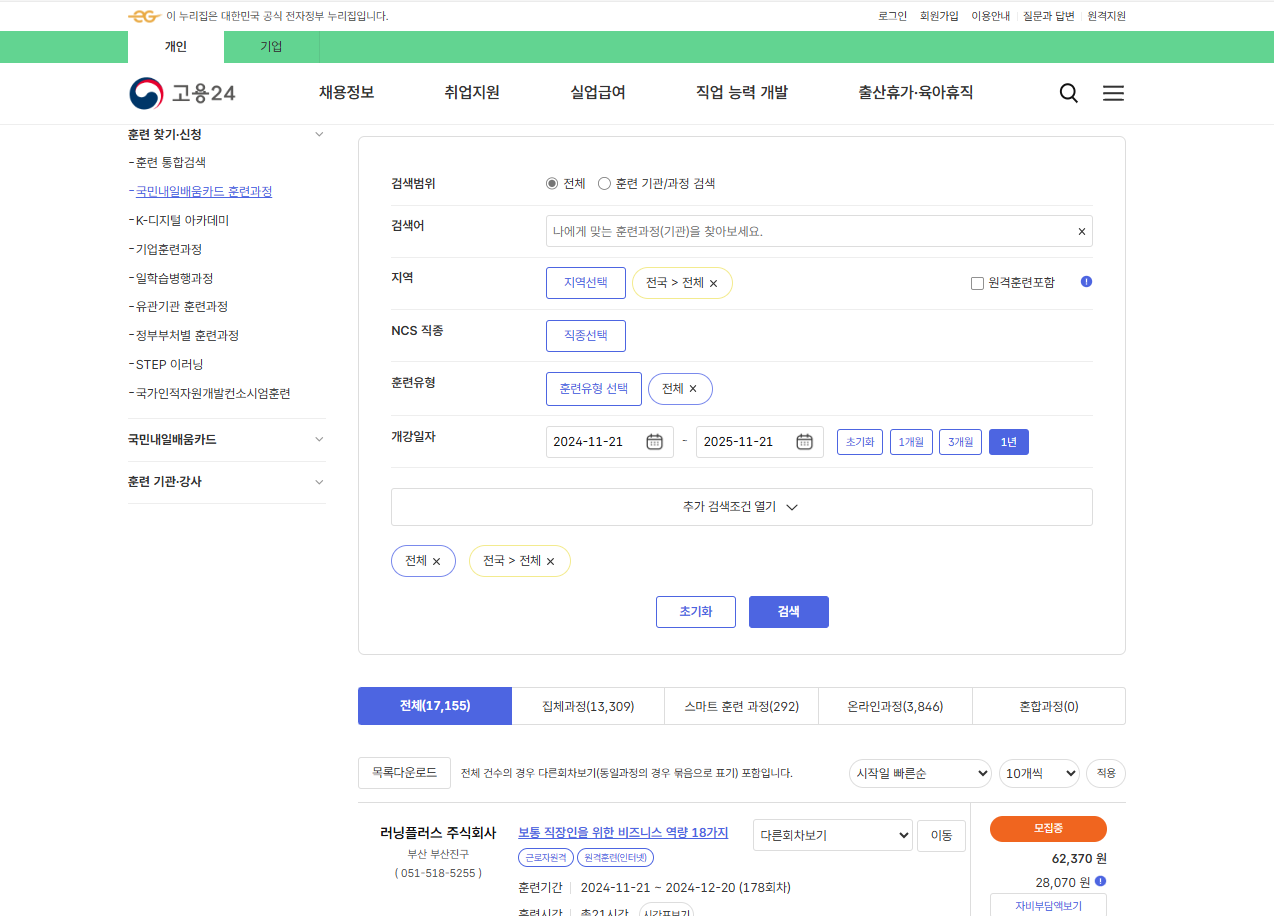 고용24 직업능력개발 -- 훈련찾기, 신청