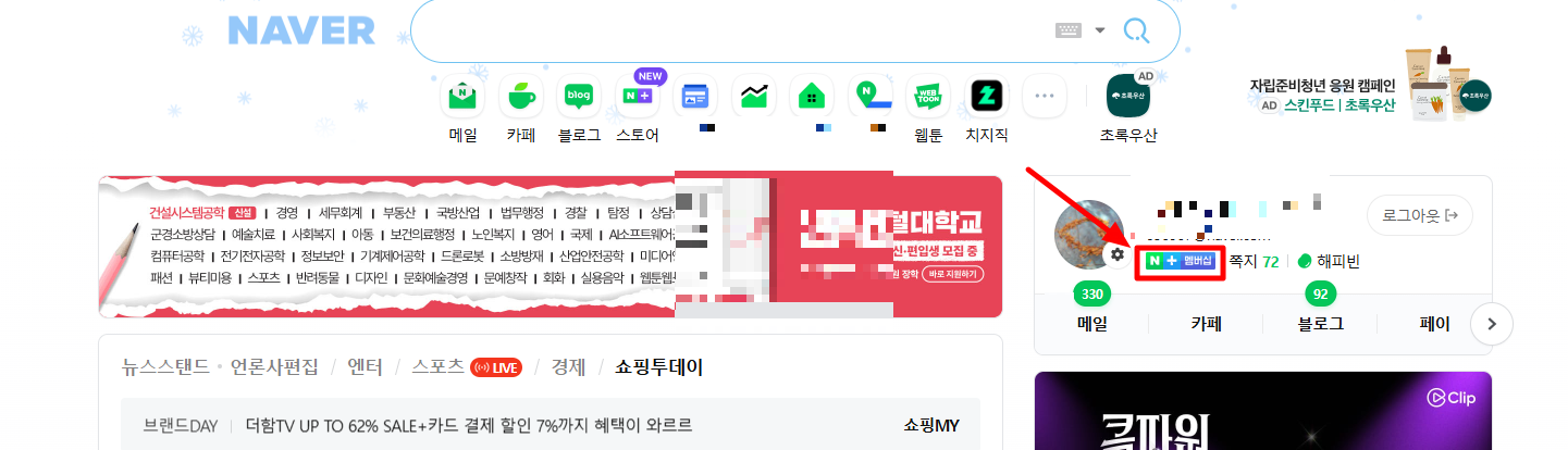 1. 네이버 로그인 후 ID 밑의 멤버십 아이콘 클릭!