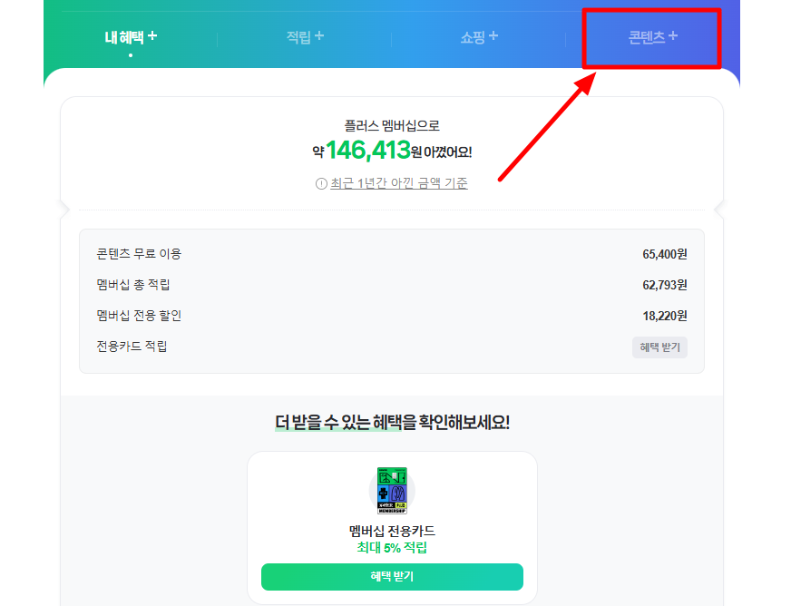 3. 멤버십 화면에서 콘텐츠+ 클릭!