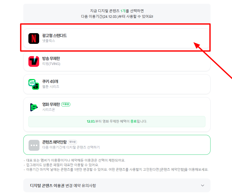 4. 콘텐츠 화면에서 다음 달 콘텐츠 변경 예약 클릭!  - 광고형스탠다드 클릭!