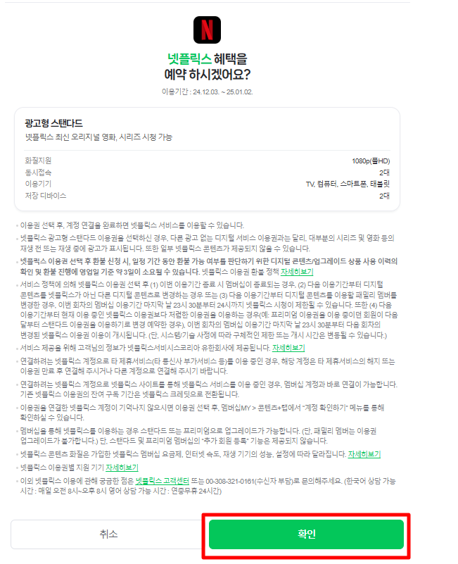 5. 넷플릭스 이용권 정보에 대해 대략 살펴보신 후 '확인' 클릭! 그럼 12월 3일 부터 넷플릭스를 시청할 수 있습니다.