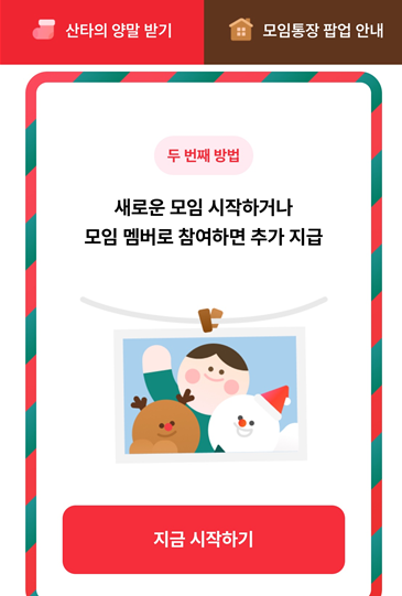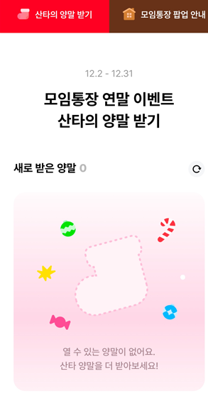산타 양말을 늘릴 수 있는 방법이 있는데 친구에게 자신의 링크를 보내는 방법과 새로운 모임통장을 만드는 방법입니다.!
