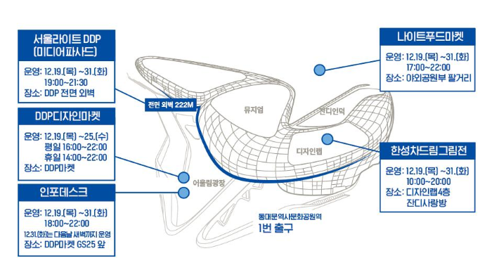 미디어 파사드 외에도 디자인 마켓 및 푸드 마켓 등 여러 프로그램이 DDP에서 진행되니 함께 구경하시면 더욱 좋을 것 같네요.
