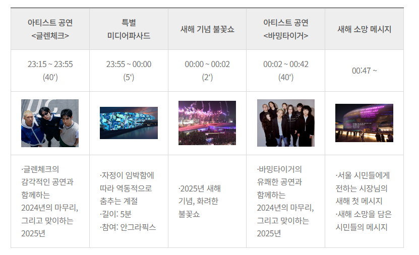 - 새해맞이 행사 일정: 2024년 12월 31일 ~ 2025년 1월 1일