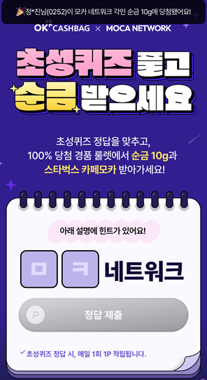 대표 마일리지 서비스 'OK Cashbag'과 블록체인 투자사 '애니모카 브랜즈'의 '모카 네트워크가 새로운 협업을 준비하고 있습니다. 이를 기념하여 오케이 캐시백 어플에서 당첨 100% 룰렛 이벤트를 진행하고 있으니 참여해보시기 바랍니다. 경품으로 순금에서 커피, 캐쉬백 포인트까지 있으니 무조건 참여 고고!!