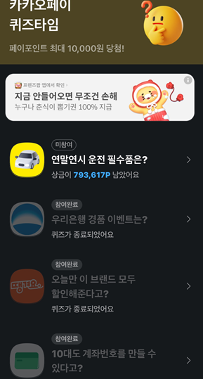 - 카카오톡 앱에서 '카카오페이' 서비스를 선택하거나, 퀴즈 관련 알림 메시지를 통해 접근할 수 있습니다.