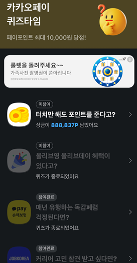 - 카카오톡 앱에서 '카카오페이' 서비스를 선택하거나, 퀴즈 관련 알림 메시지를 통해 접근할 수 있습니다.