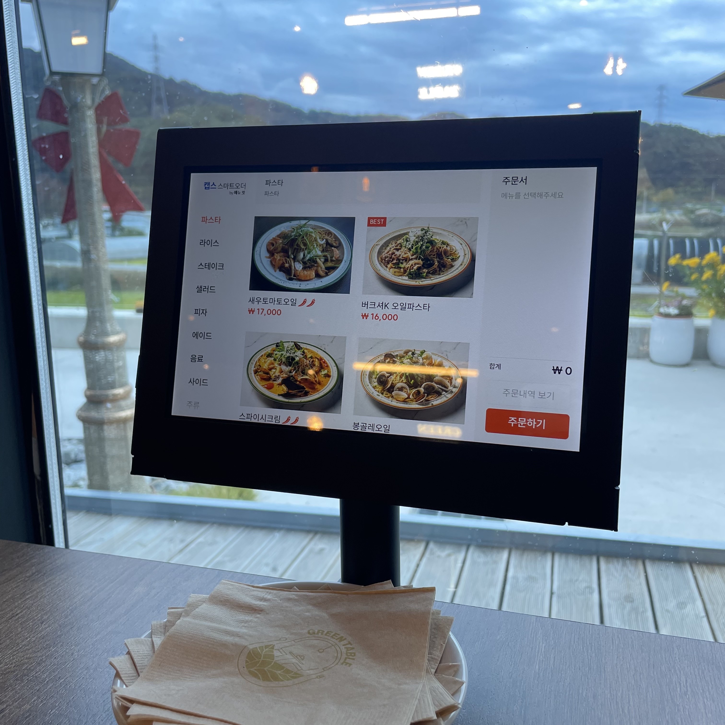 전체적인 메뉴는 위와 같답니다. 다양한 음식을 먹고 싶었지만 역시나... 소식가... 저흰 버그셔k 오일파스타와 스파이시크림파스타를 주문하였습니다. 전체적인 주문은 테블릿으로 주문 후 결제는 먹고 난 후 하시면 됩니다.