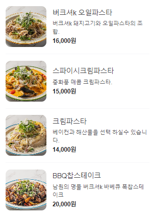 | 파스타류 | 찹스테이크도 있답니다 | 리소토 류 | 피자류(만원?!) |
