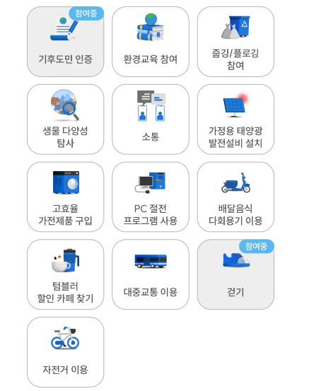 쉽게 참여할 수 있는 것으로는 걷기 / 자전거 이용 / 대중교통이용 정도가 되겠네요.