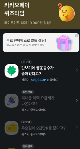 - 카카오톡 앱에서 '카카오페이' 서비스를 선택하거나, 퀴즈 관련 알림 메시지를 통해 접근할 수 있습니다.