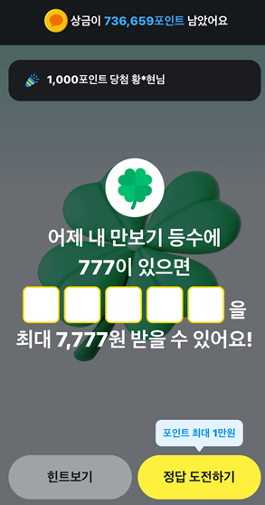 만보기: 어제 내 만보기 등수에 777이 있으면 행운당첨금을 최대 7,777원 받을 수 있어요!