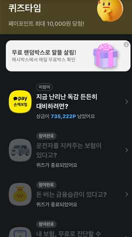 - 카카오톡 앱에서 '카카오페이' 서비스를 선택하거나, 퀴즈 관련 알림 메시지를 통해 접근할 수 있습니다.
