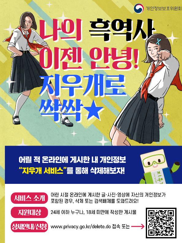 안녕하세요? 세상이야기에 귀를 쫑긋 세우고 다니는 '당나귀귀'입니다. 이번에 소개해 드릴 정보는 '지우개(지켜야할 우리들의 개인정도)서비스'입니다. 요즘 개인정보를 이용한 보이스피싱과 같은 신종 범죄들로 개인정보 보호가 더욱 중시되고 있는데요. 어린 시절에 무심코 올린 내 사진이나 영상, 개인정보가 담겨있는 글 등이 지금도 인터넷에 떠돌고 있다면 얼마나 불안할까요? 특히 다른 사람이 올린 경우 자신이 마음대로 지울 수 없어 더욱 난감합니다. 이런 경우를 위한 서비스가 있어 소개해 드립니다. 개인정보보호위원회에서 운영하는 '지우개서비스'입니다. 무심코 올린 개인정보가 포함된 게시물에 고통받고 있거나, 주변에 있는 아동이나 청소년이 있다면 '지우개서비스'를 이용해보세요.