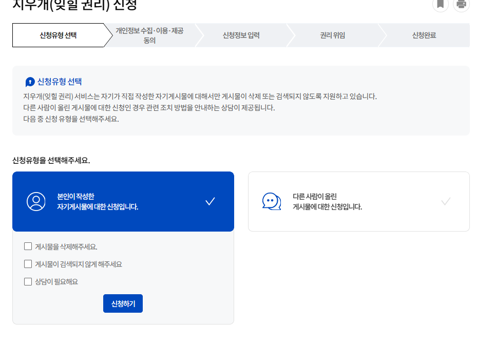 4) 신청정보 입력: 이 단계가 중요한데 자신이 지우고 싶은 게시물의 입증 자료를 입력해주어야 합니다.
