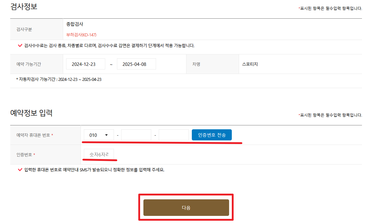 3. 차량의 검사 정보 및 검사 기간을 확인하신 후 예약 정보 입력