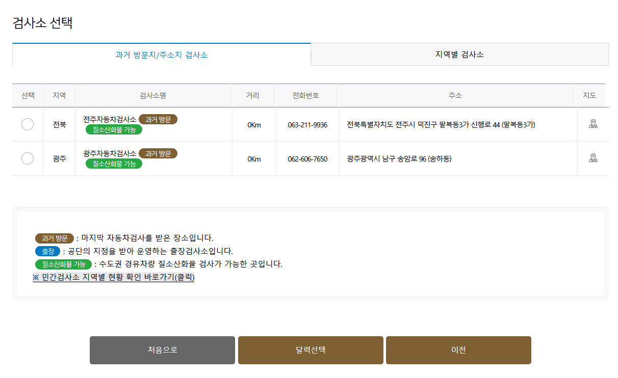 과거 검사이력이 있다면 과거 방문지가 바로 나오고 첫 검사이거나 타지역에서 검사를 받을 경우 지역별 검사소를 검색하여 선택해주시면 됩니다.