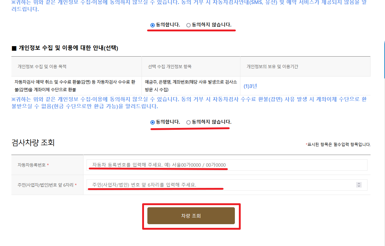 2. 약관 동의 후 자신의 차량 정보를 입력 후 차량 조회 클릭
